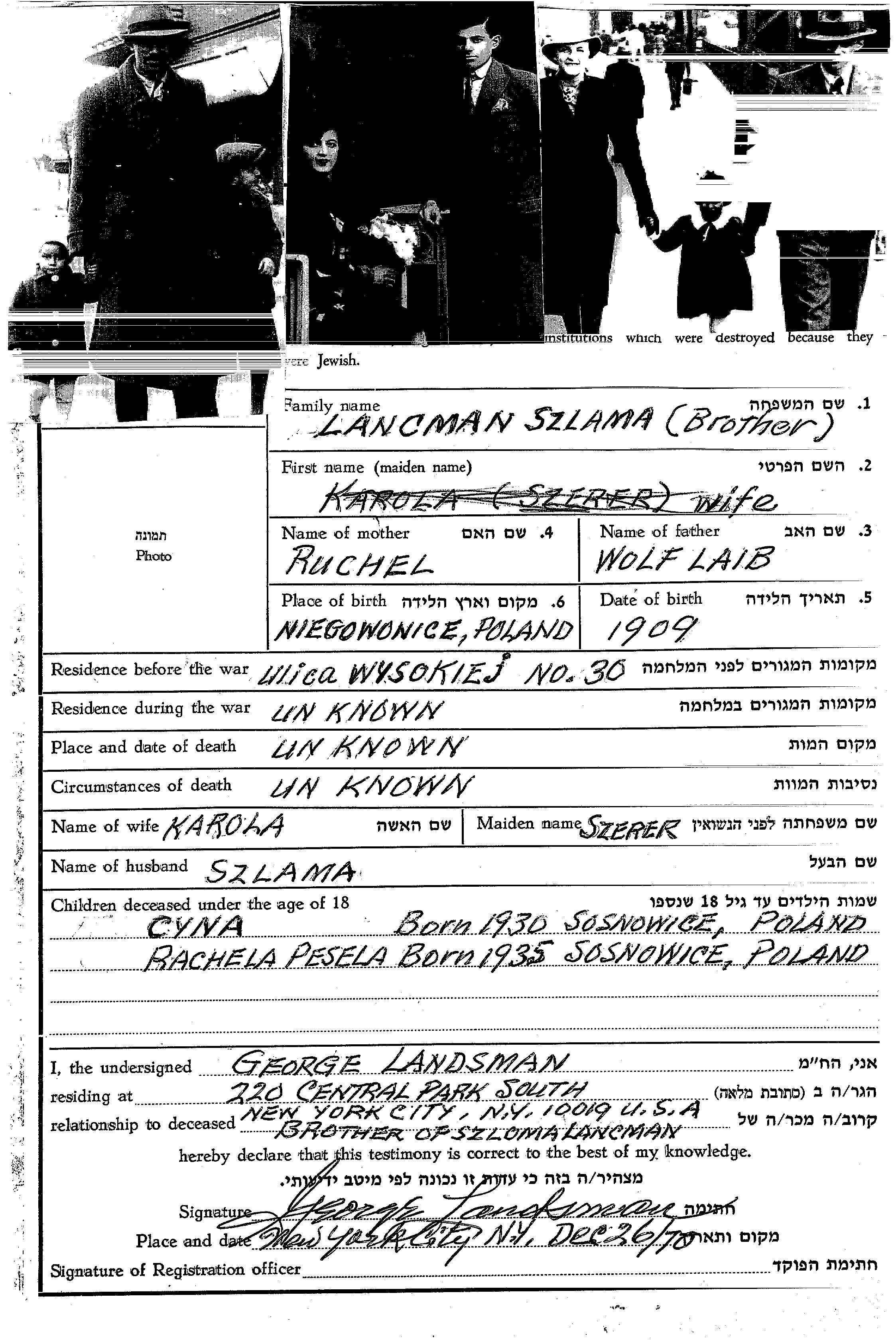 Ланцман | Рахела | Сосновец, Польша | Лист свидетельских показаний | |