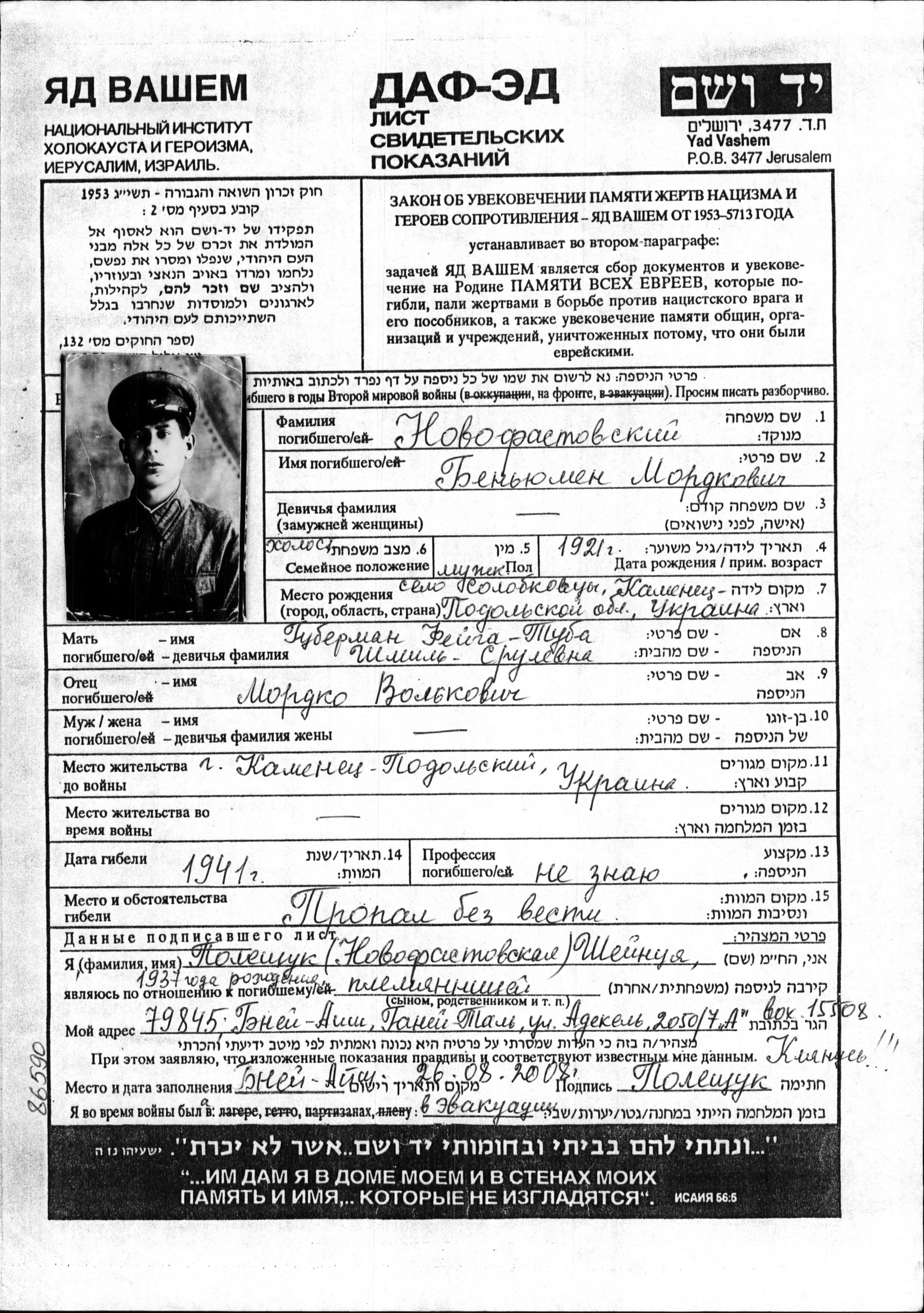 Бенюмен Новофастовски, место рождения: Солобковцы, Украина (СССР). Место жительства до войны: Каменец-Подольск, Украина (СССР).