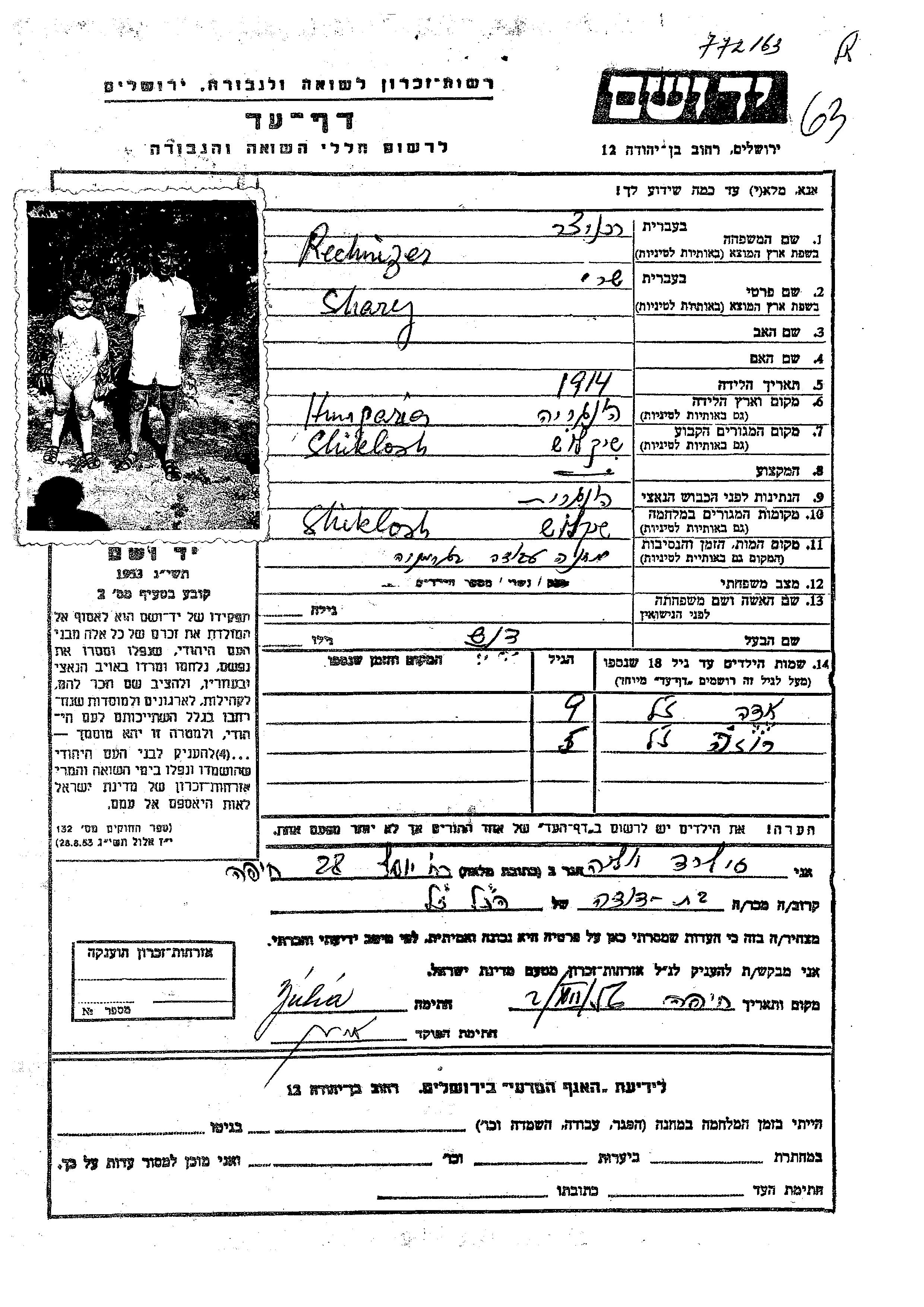 Рехницер | Шари | 1914 | Шиклош, Венгрия | Лист свидетельских показаний |