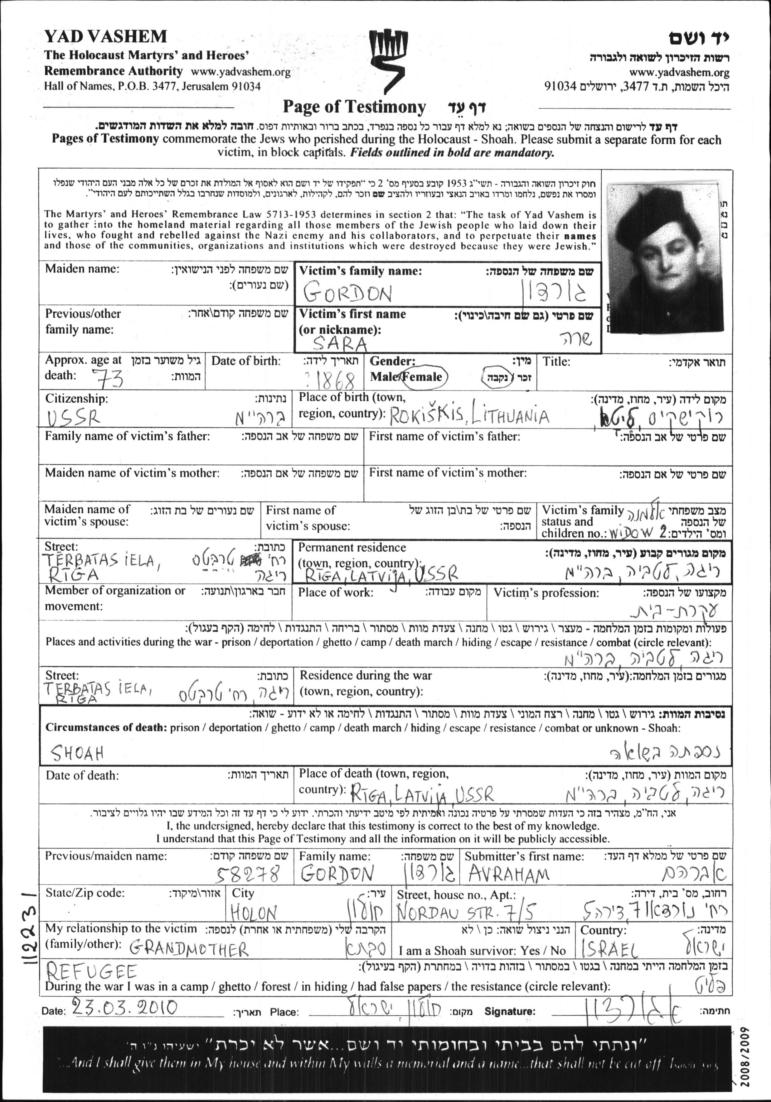 Сара Гордон, место рождения: Рокишкис, Литва. Домохозяйка. Место жительства до войны: Рига, Латвия.