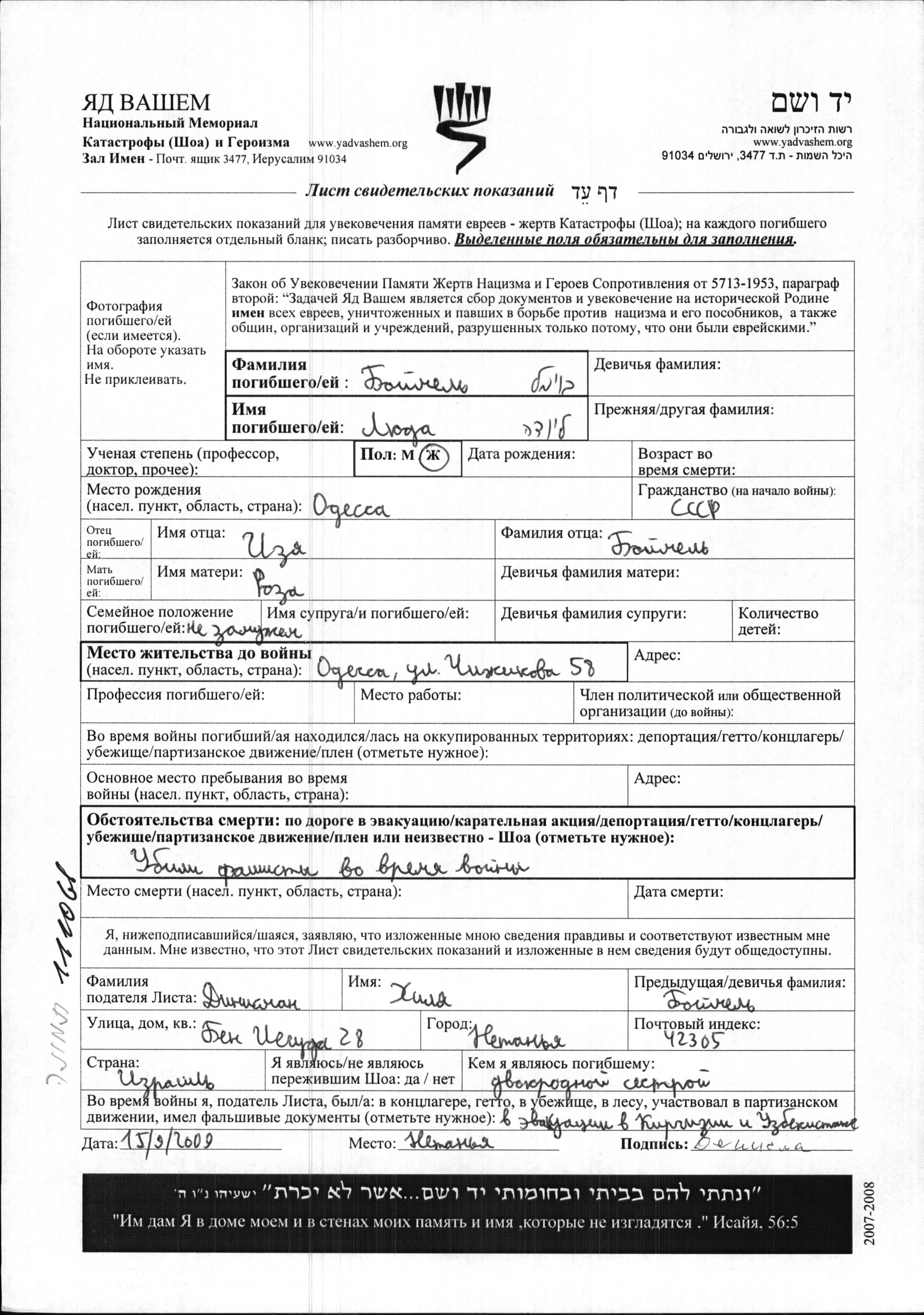 Боймель Люда Одесса, Украина (СССР) Лист свидетельских показаний