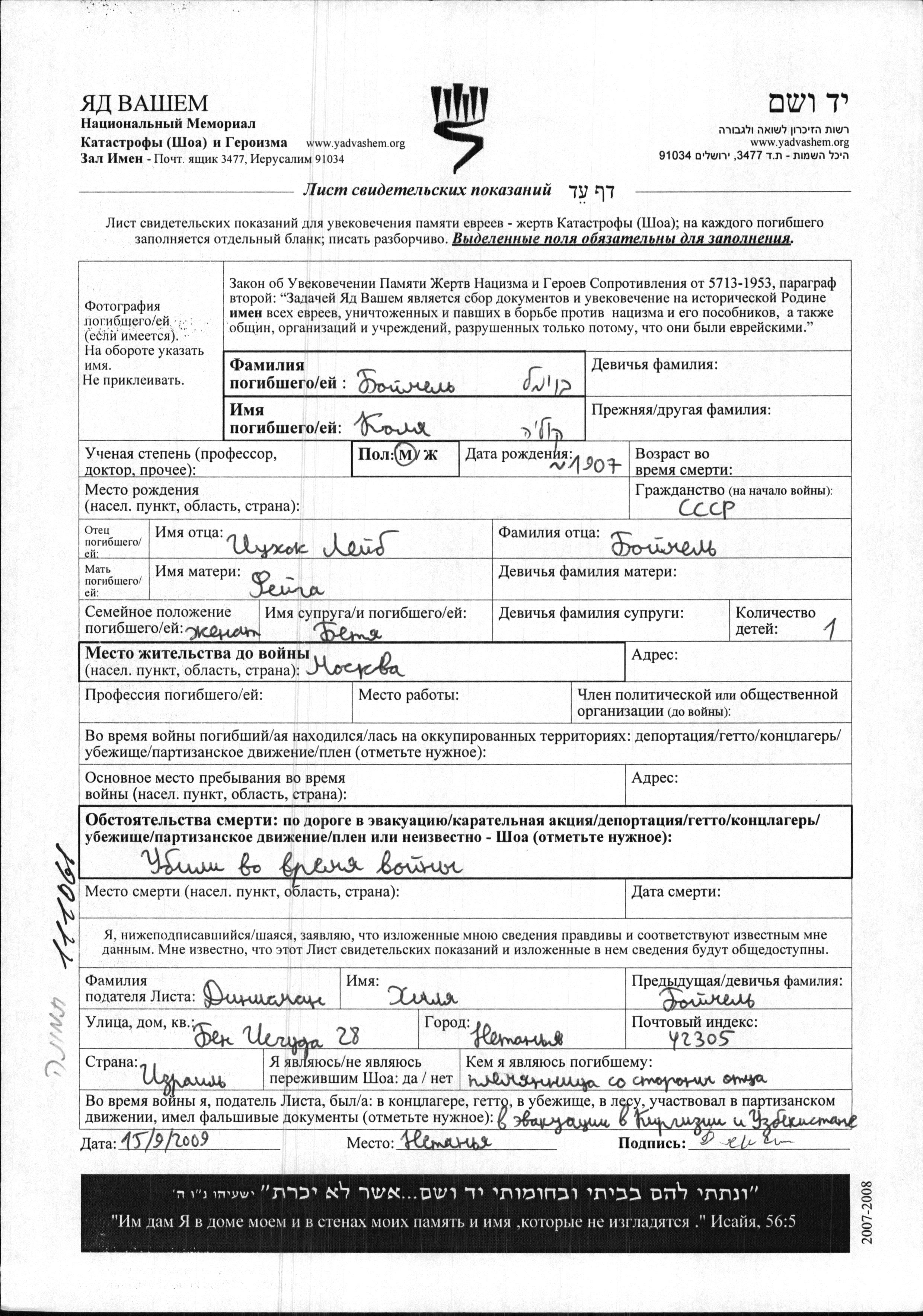 Боймель Коля 1907 Москва, Россия (СССР) Лист свидетельских показаний