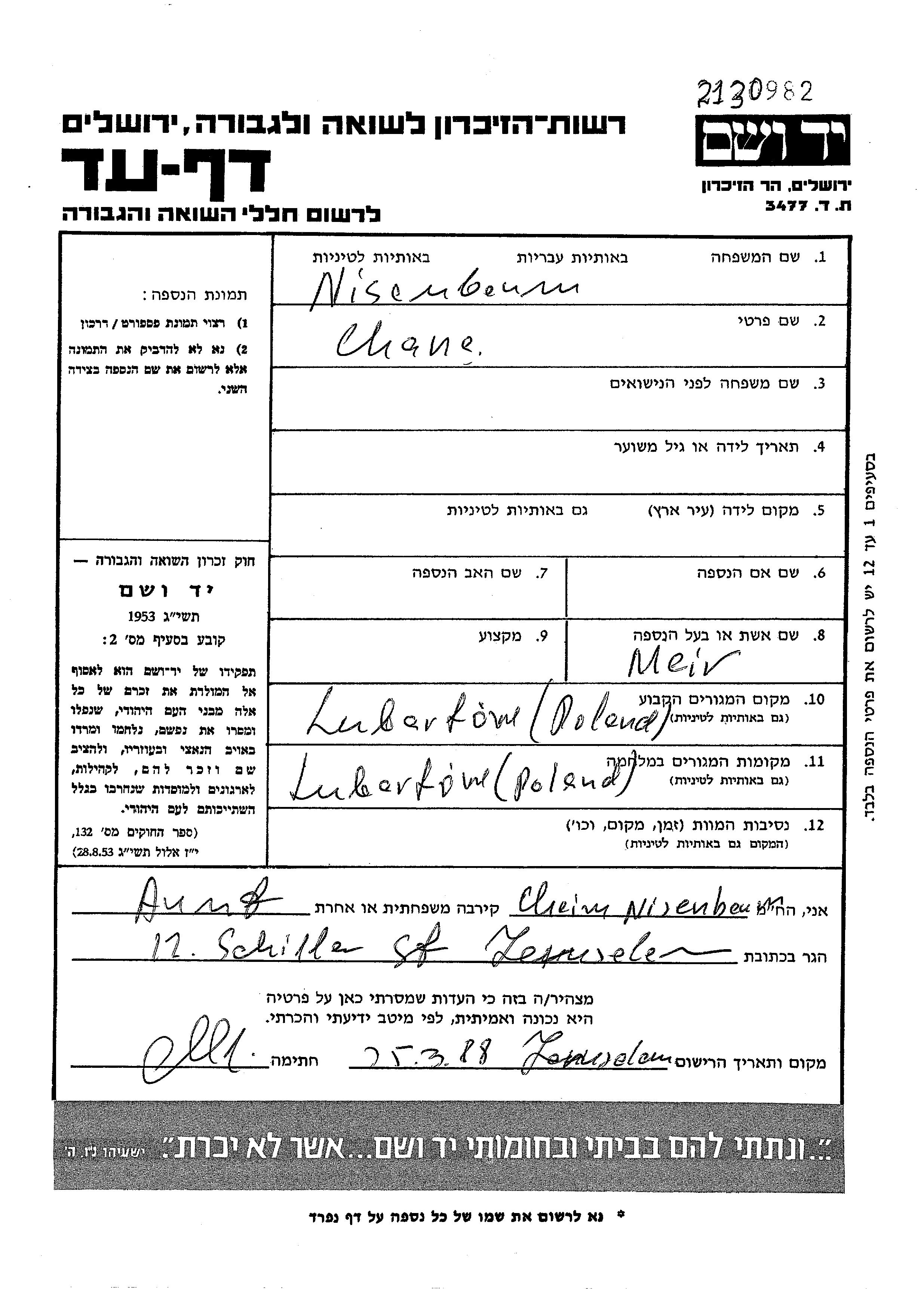 Хана Нисенбаум. Женат / замужем. Место жительства до войны: Любартув, Польша. Место во время войны: Любартув, Польша.