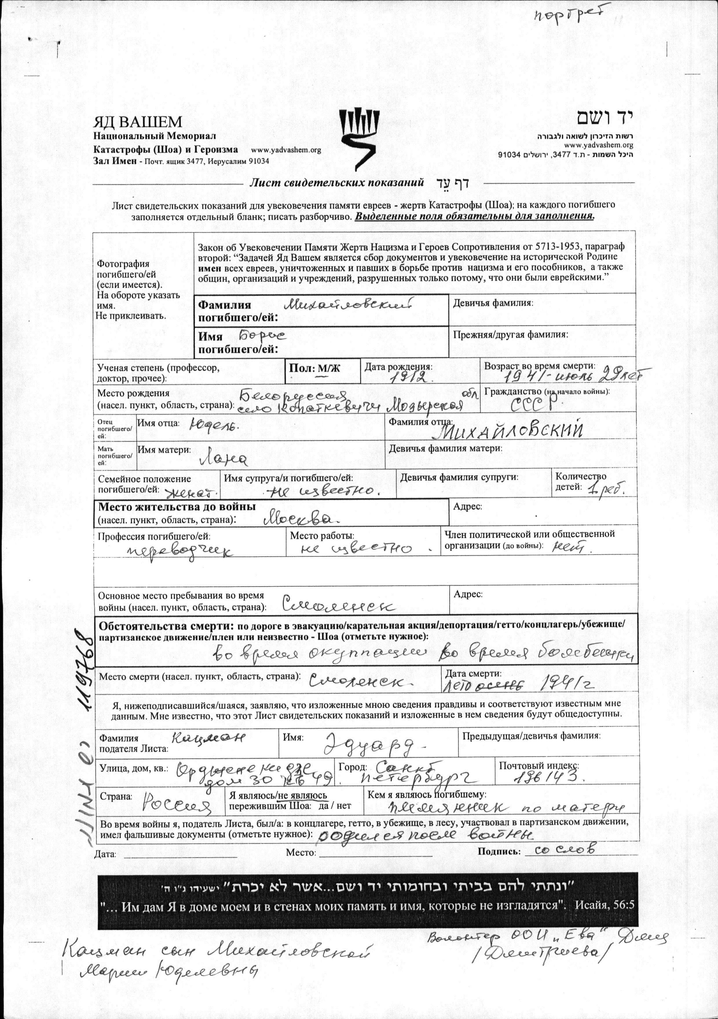 Михайловский Борис 1912 Москва, Россия (СССР) Лист свидетельских показаний