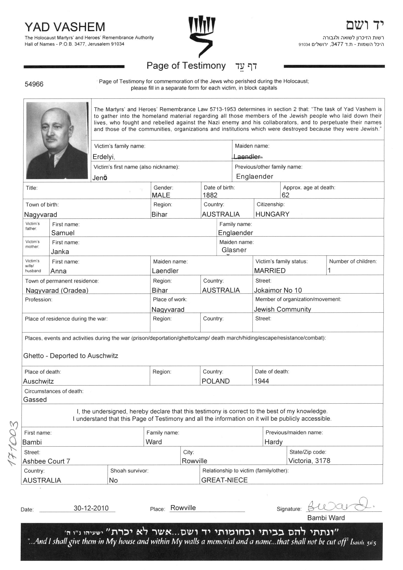 | Эрдейи Энглендер | Ено | 1882 | Надьварад, Румыния | Лист свидетельских показаний (электронный, с подписью) |