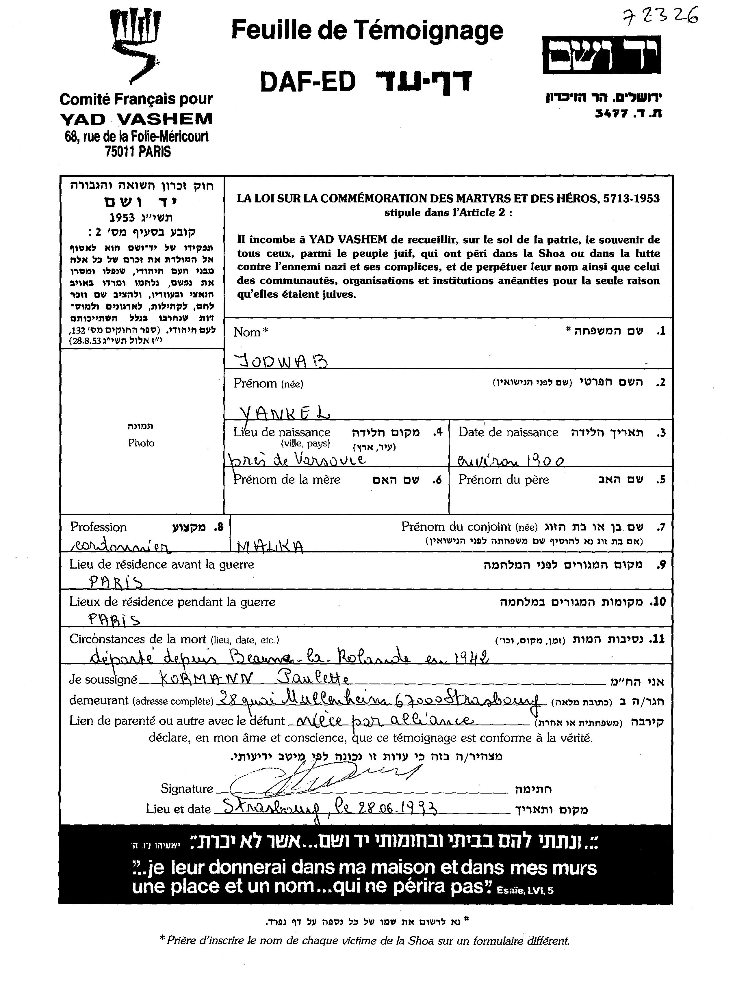 Янкель Йодваб, место рождения: Польша. Сапожник. Женат / замужем. Место жительства до войны: Париж, Франция. Место во время войны: Париж, Франция.