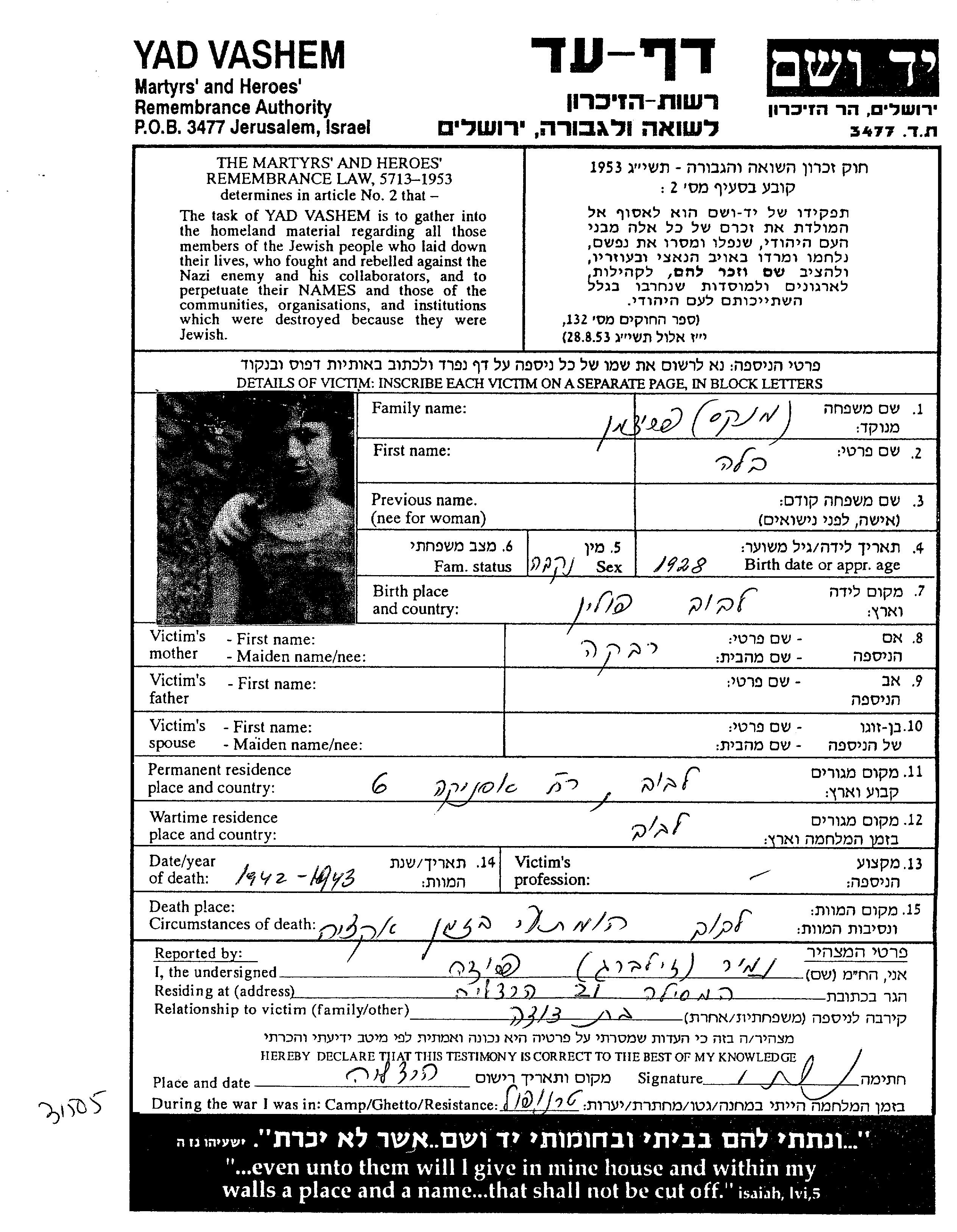 Яд Вашем - Листы свидетельских показаний Мемориального фонда