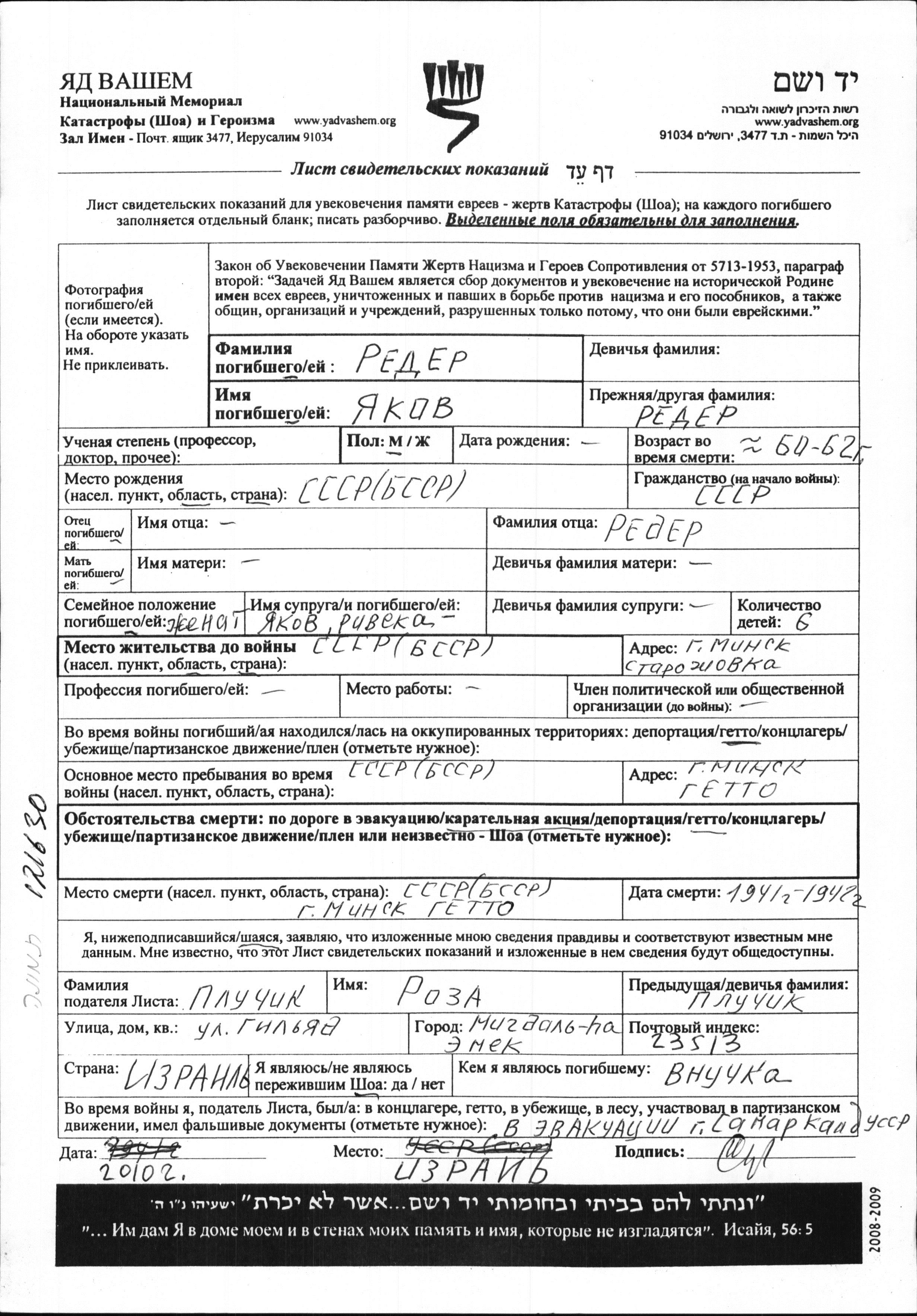 Редер | Яков | Минск, Белоруссия (СССР) | Лист свидетельских показаний | |