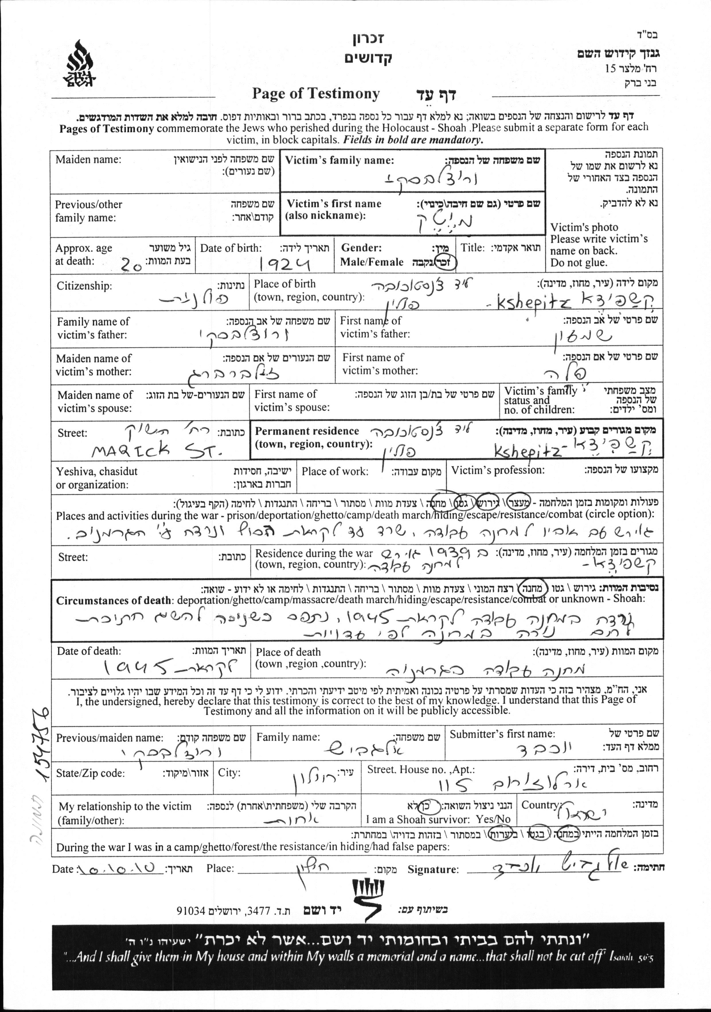 Яд Вашем - Листы свидетельских показаний Мемориального фонда
