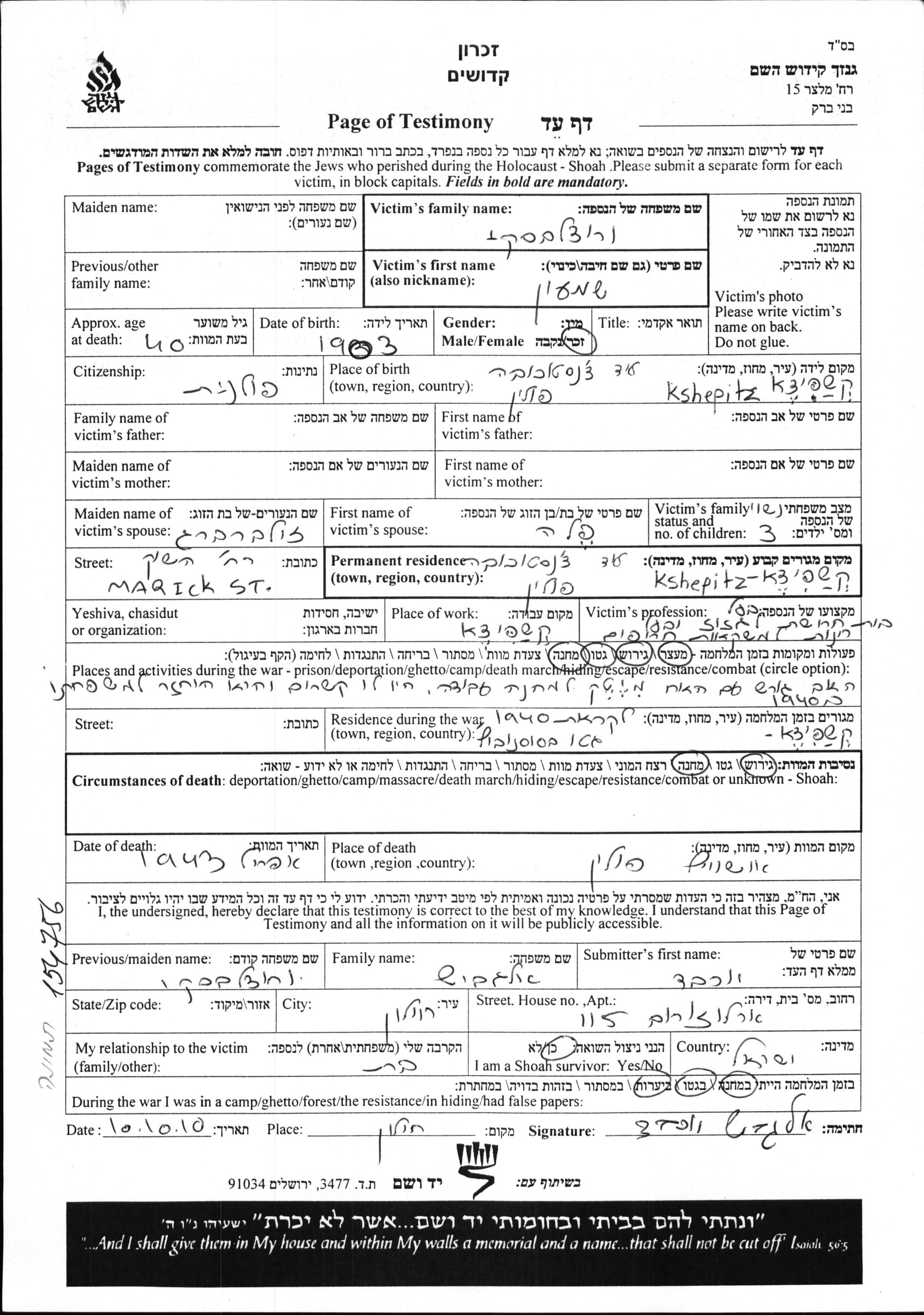 Яд Вашем - Листы свидетельских показаний Мемориального фонда