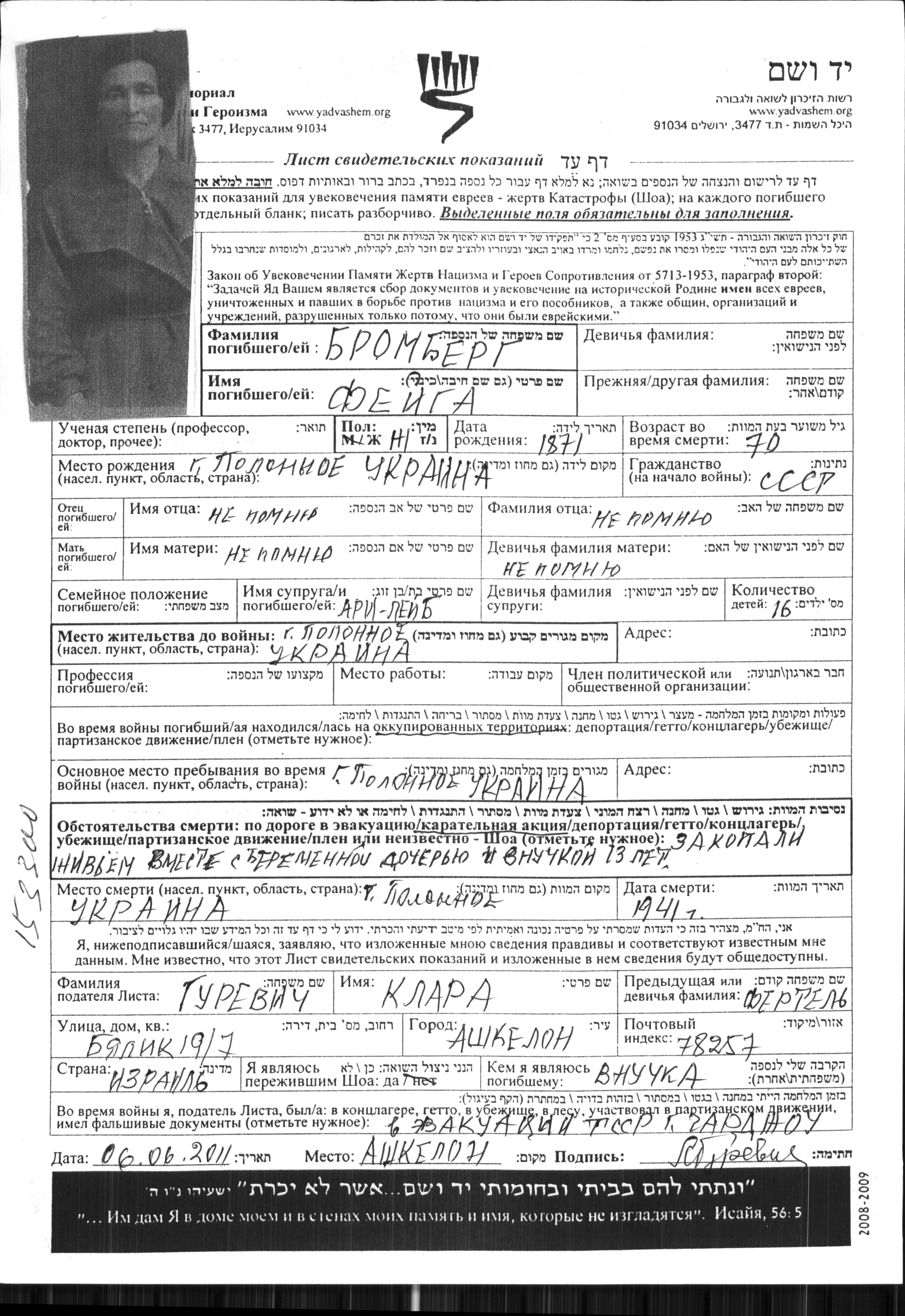 Фейга Бромберг, место рождения: Полонное, Украина (СССР). Место жительства до войны: Полонное, Украина (СССР).