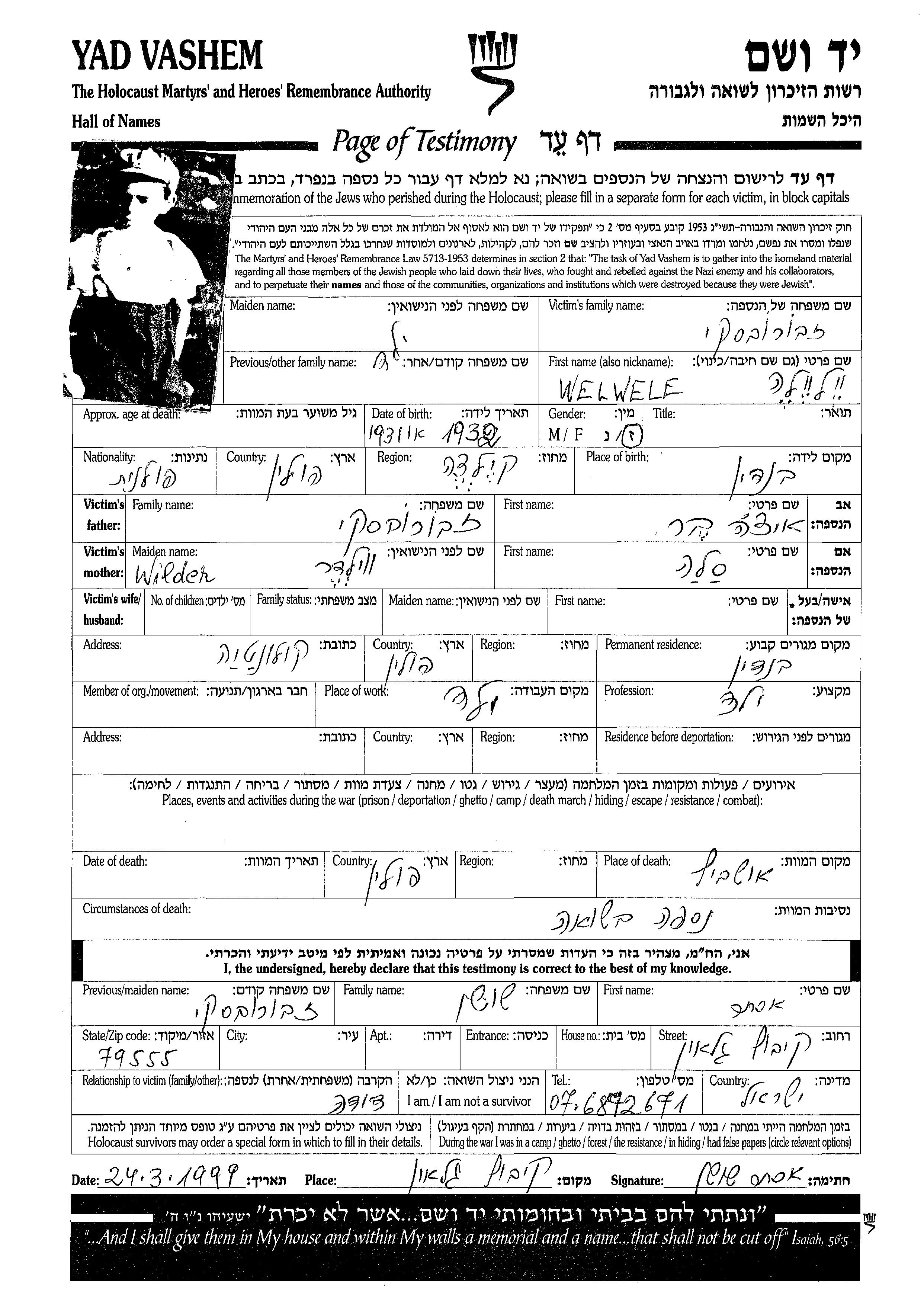 Зубровски | Вельвеле | 1931 | Бендзин, Польша | Лист свидетельских показаний |