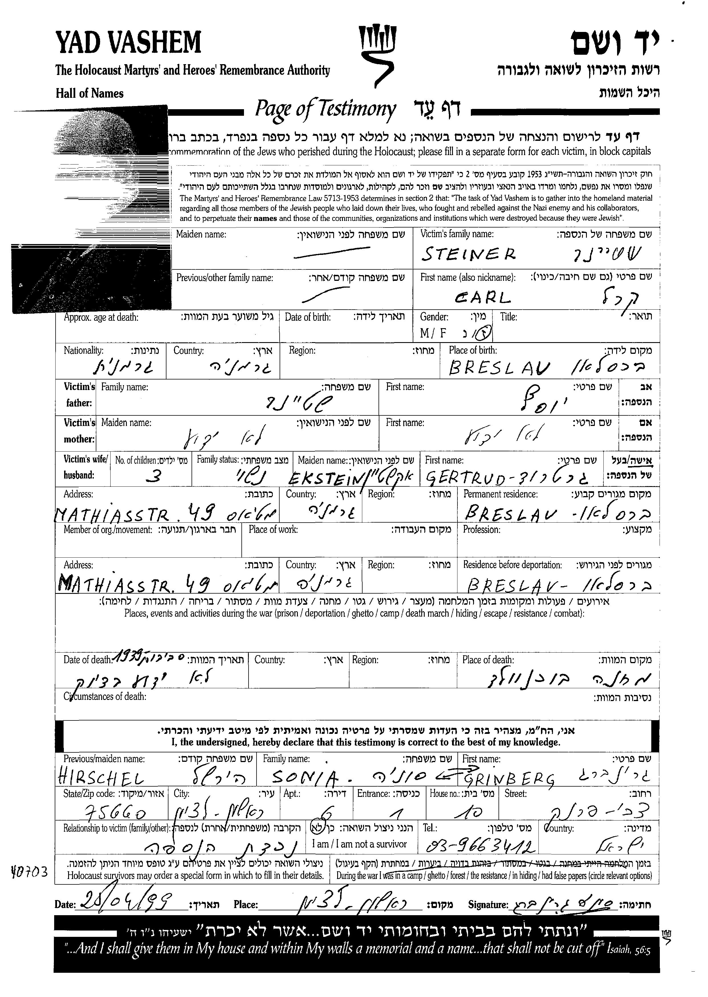 Карл Штайнер, место рождения: Бреслау, Германия. Место жительства до войны: Бреслау, Германия.