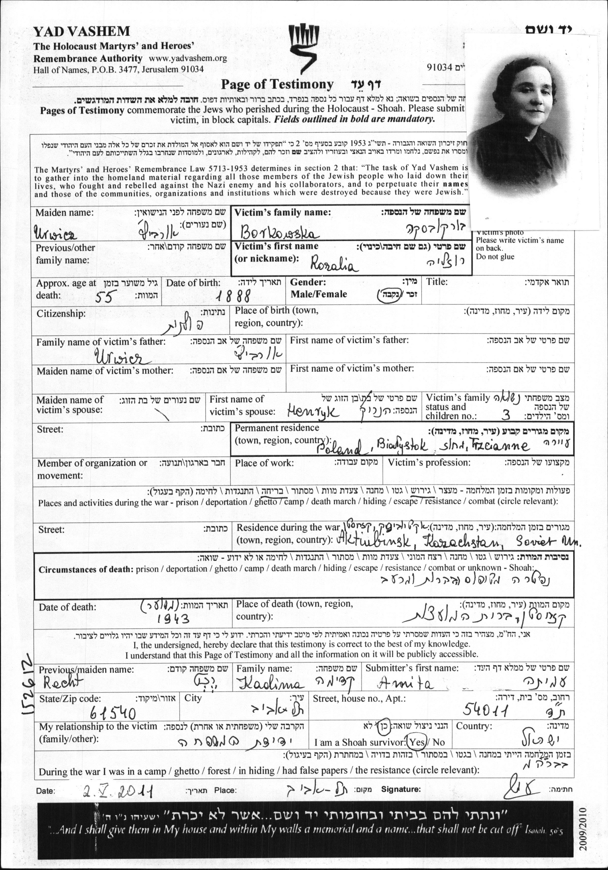 | Борковска | Розалия | 1888 | Тшцянне, Польша | Лист свидетельских показаний |