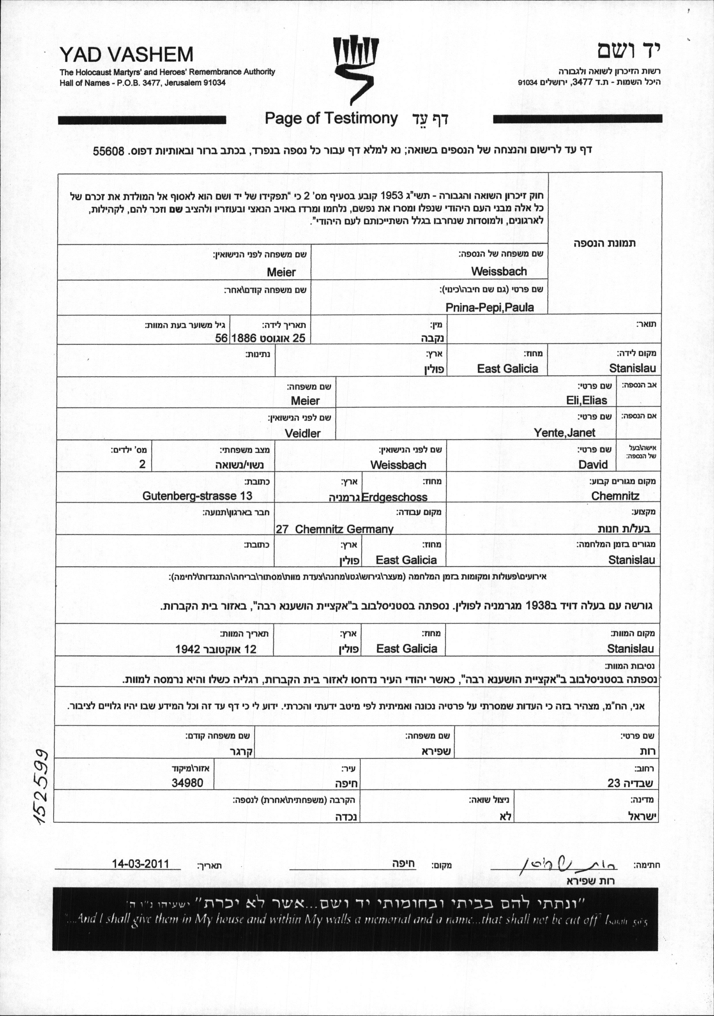 Паула Пнина Пепи уничтоженa в период Шоа. место смерти: Станиславув, Польша в 12/10/1942.