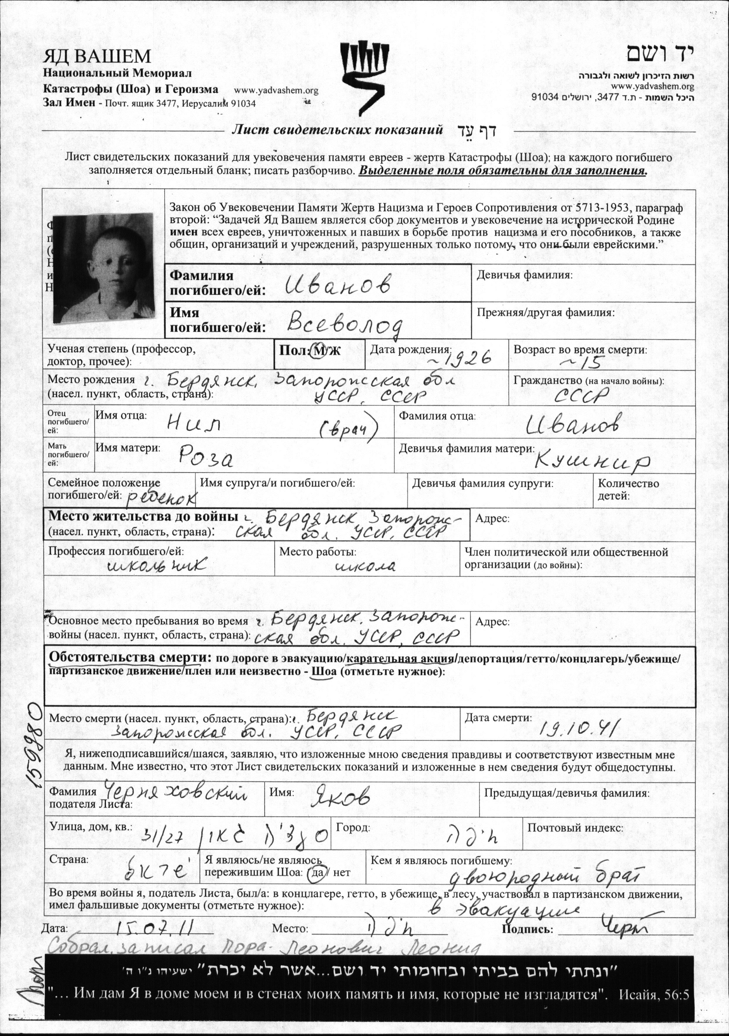 Иванов Всеволод 1926 Бердянск, Украина (СССР) Лист свидетельских показаний