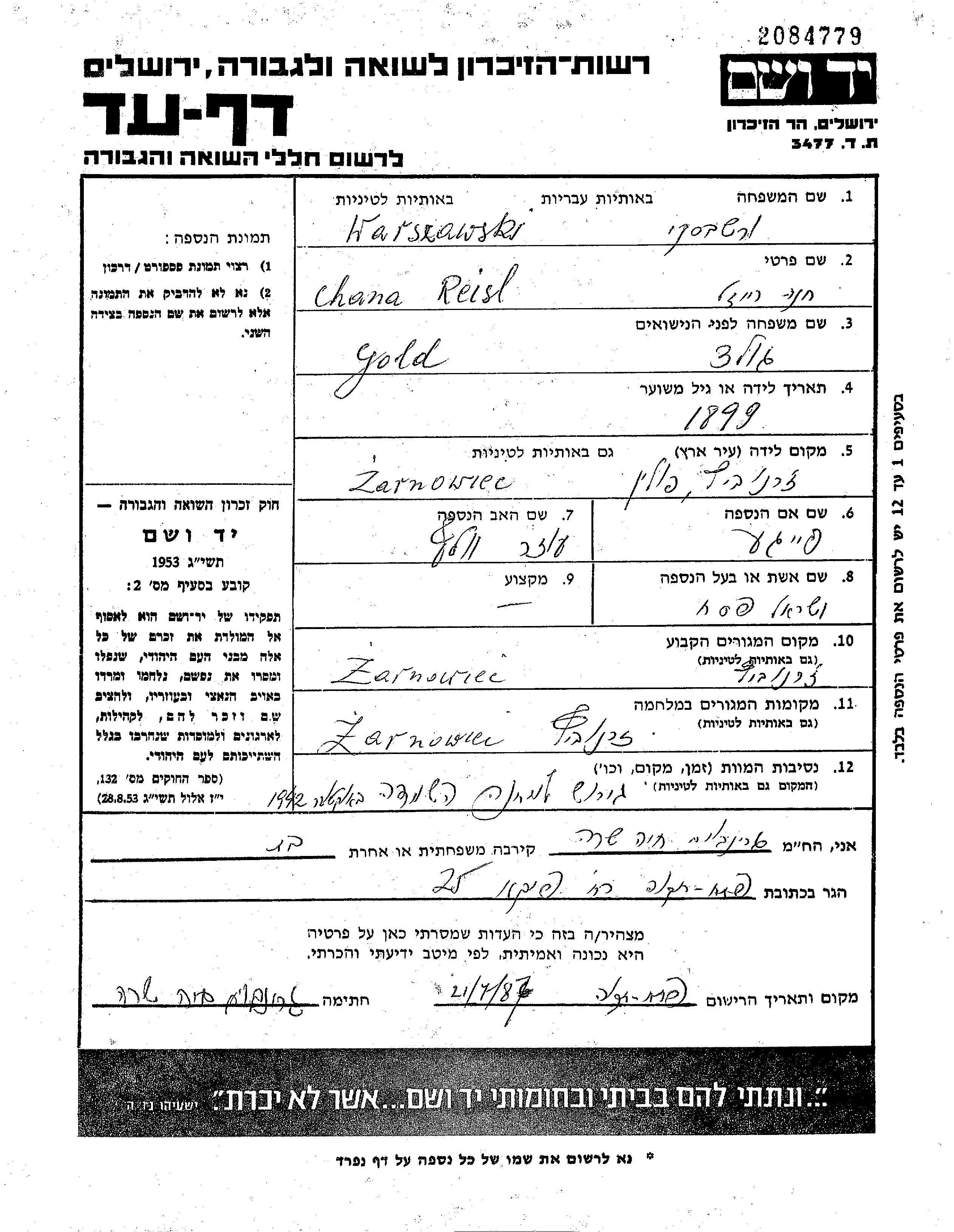 | Варшавский | Хана Рейзл | 1899 | Жарновец, Польша | Лист свидетельских показаний |