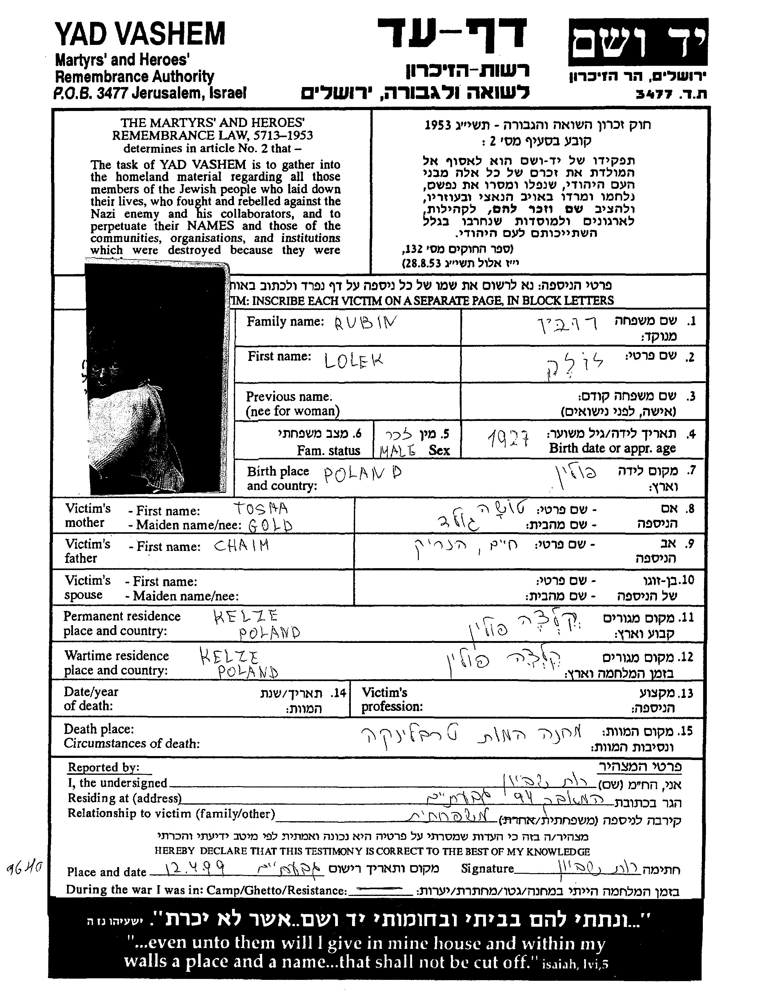 Лёлек Рубин, место рождения: Польша. Место жительства до войны: Кельце, Польша.