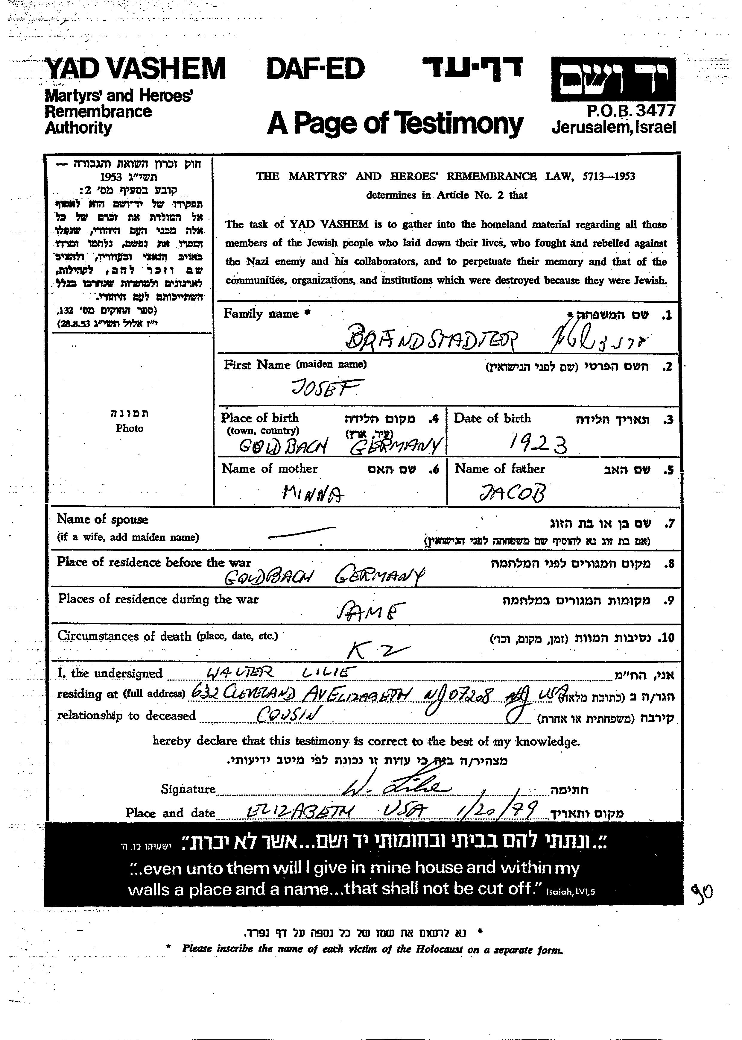 Брандштаттер | Йосеф | Гольдбах, Германия | Лист свидетельских показаний | |