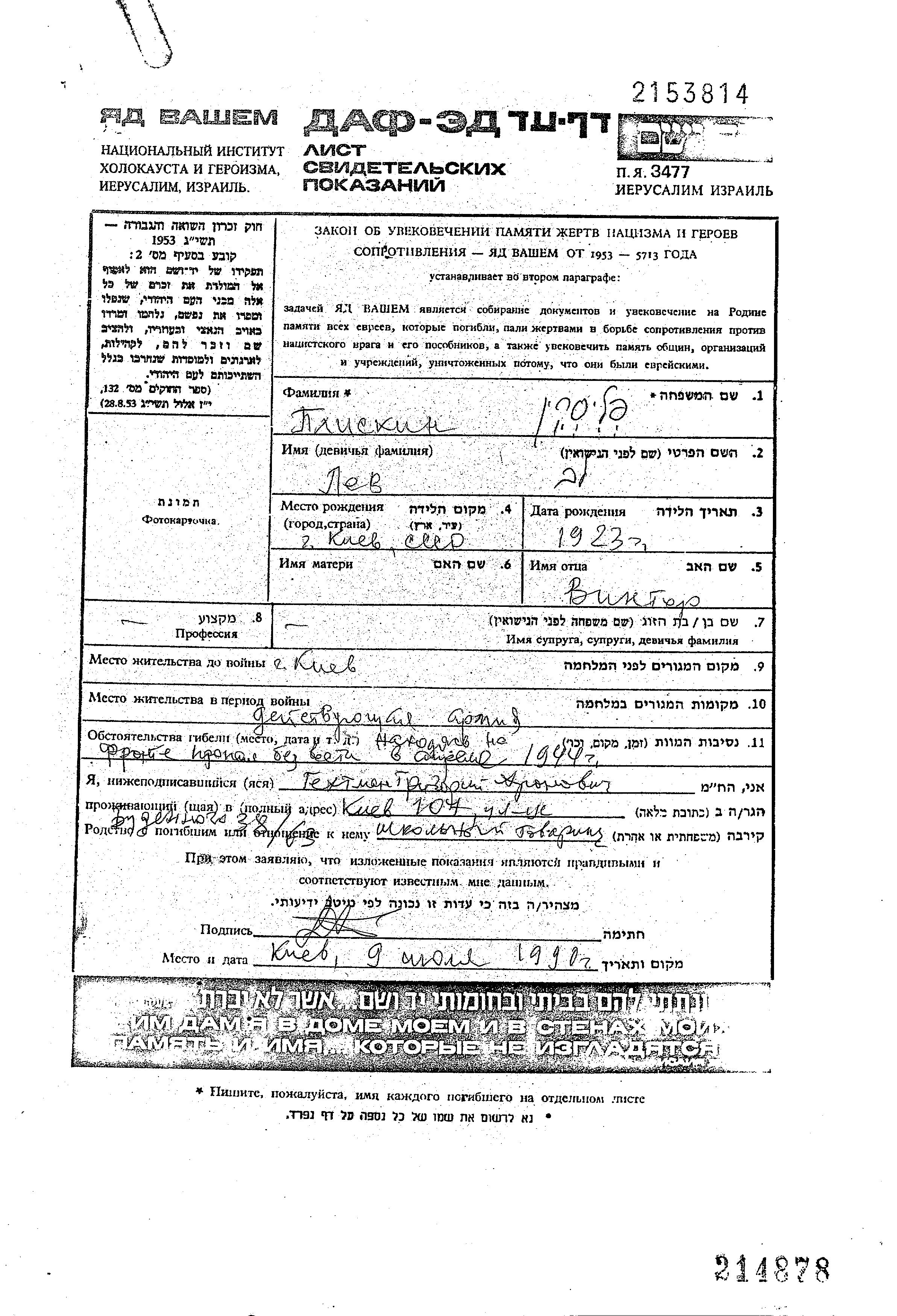 Плискин Лев 1923 Киев, Украина (СССР) Лист свидетельских показаний