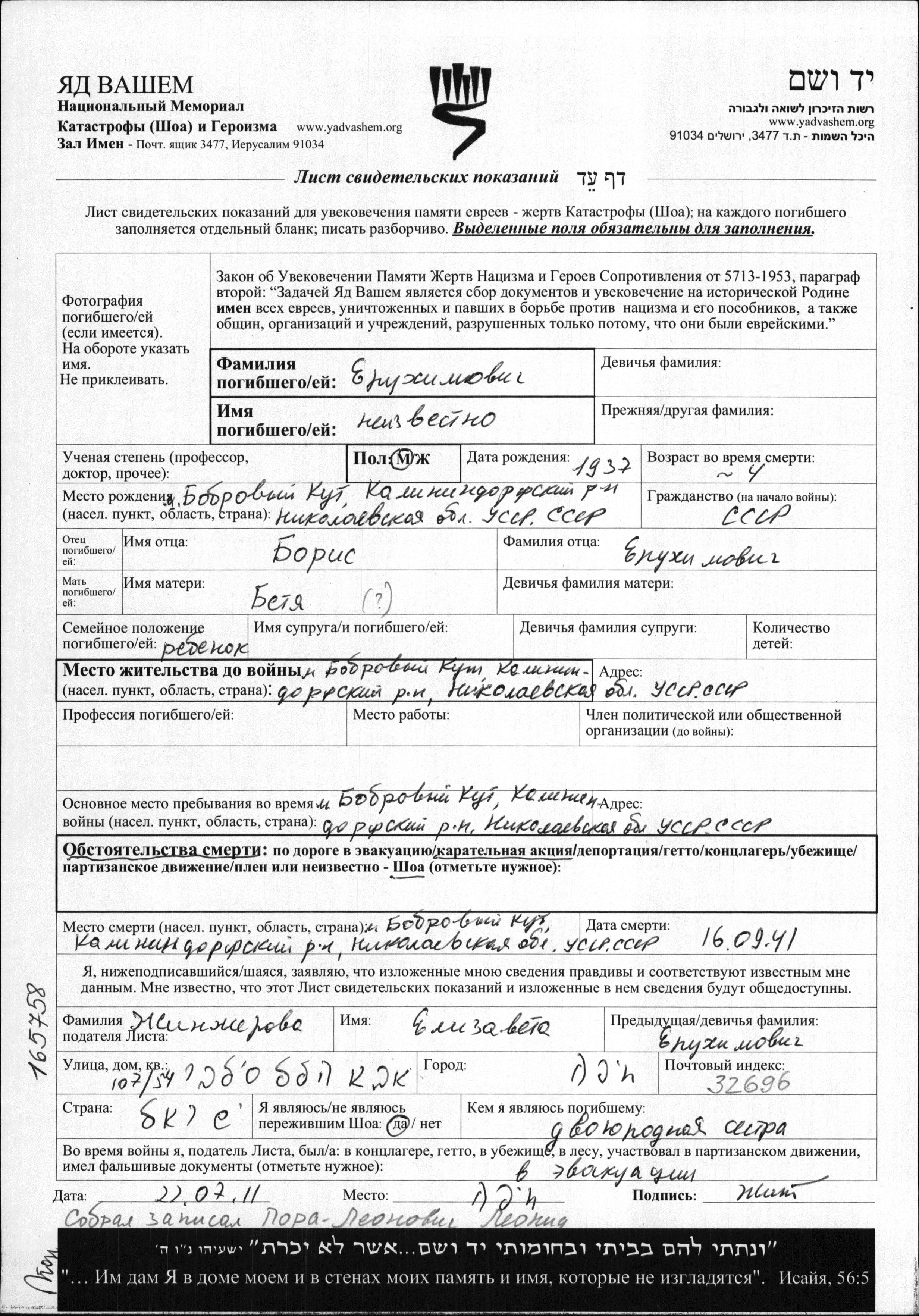 Яд Вашем - Листы свидетельских показаний Мемориального фонда