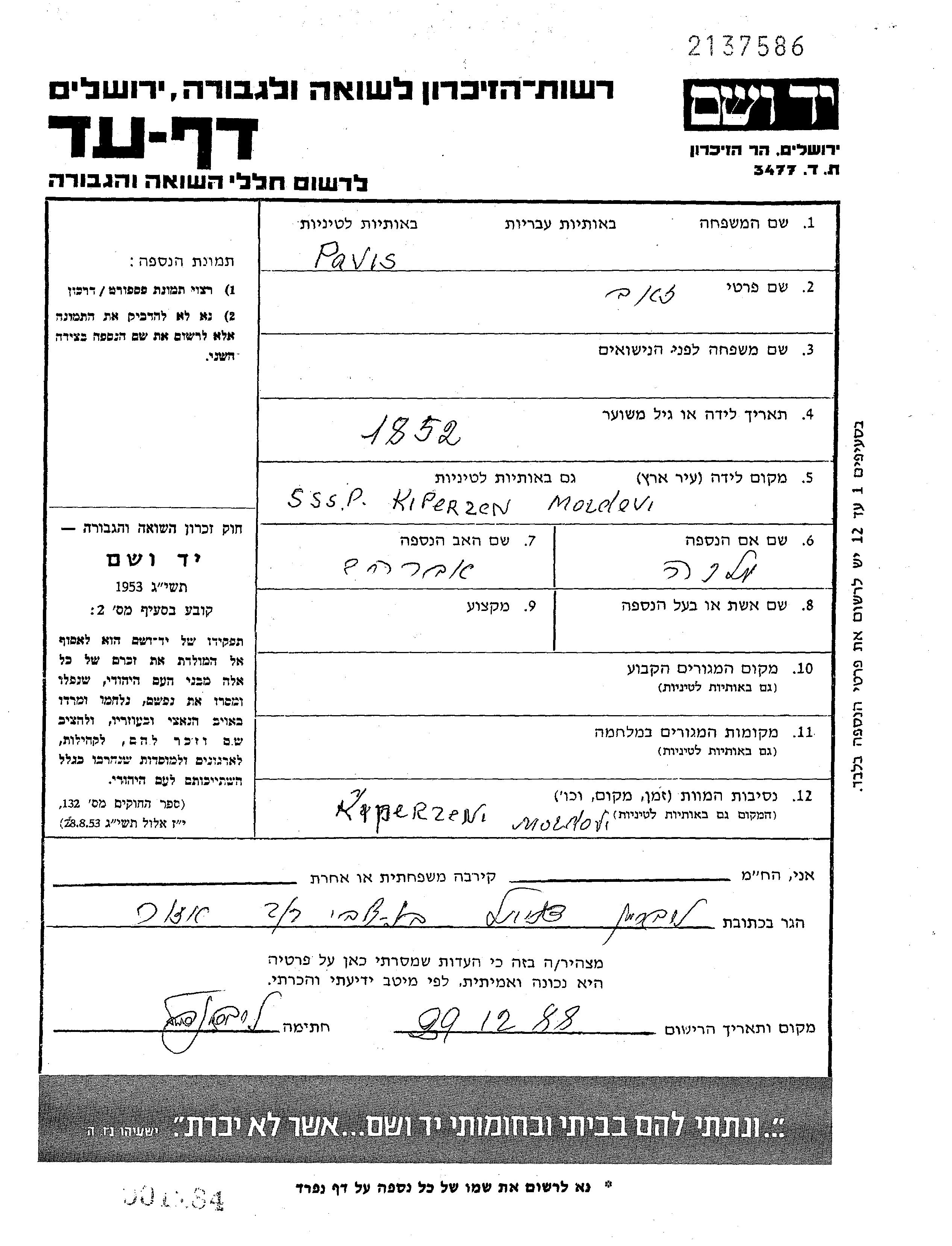 Зеев Павис, место рождения: Киперчень, Румыния. Отец: Абрахам, mать:Малка. Место жительства до войны: Киперчень, Румыния. Место во время войны: Киперчень, Румыния. Зеев уничтожен в период Шоа. место смерти: Киперчень, Румыния.