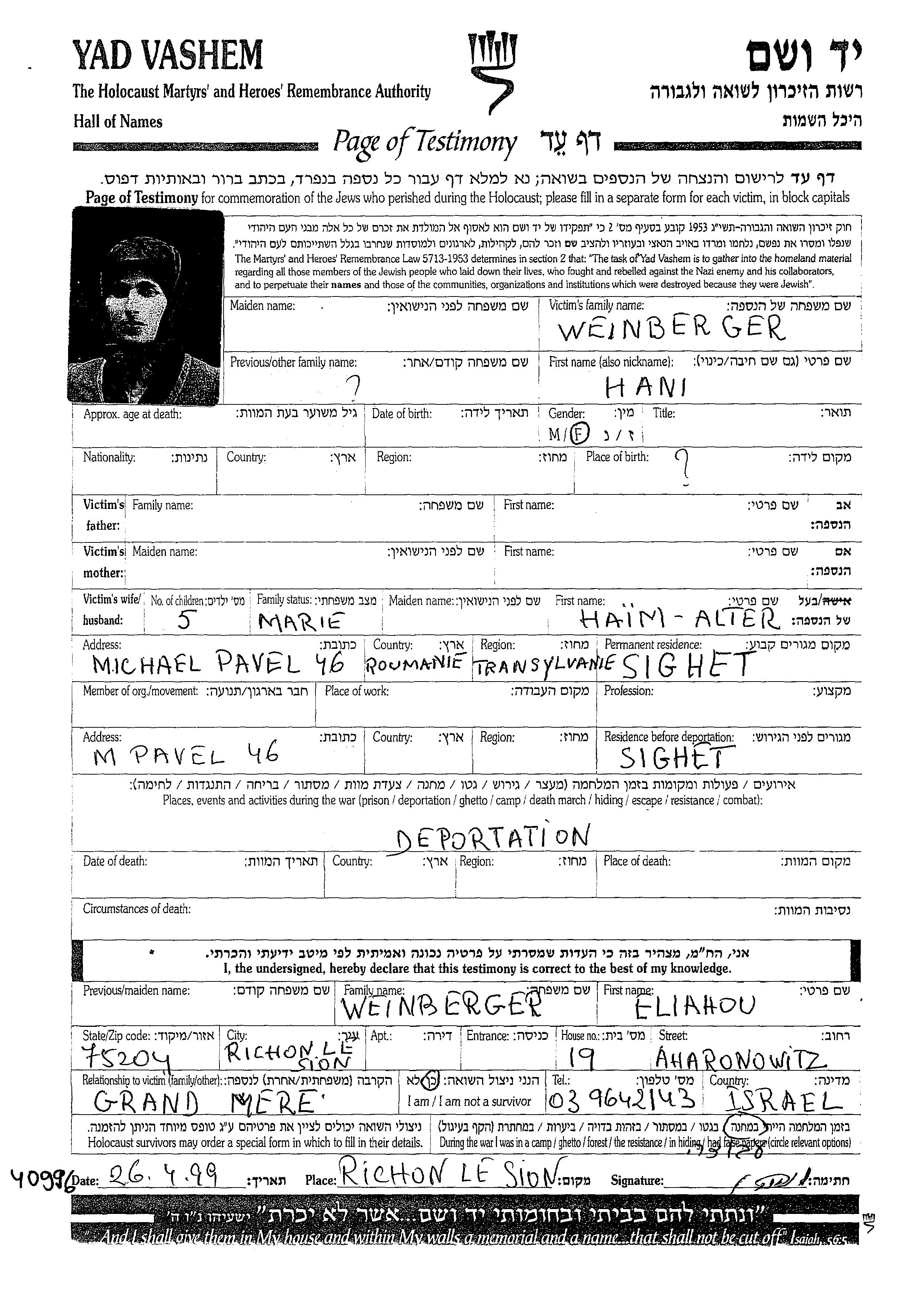 Вейнбергер Хани Сигет, Румыния Лист свидетельских показаний
