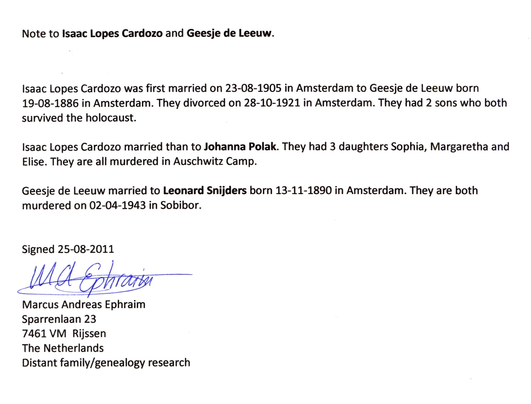 Лопес Кардозо Исаак 1885 Амстердам, Нидерланды Лист свидетельских показаний