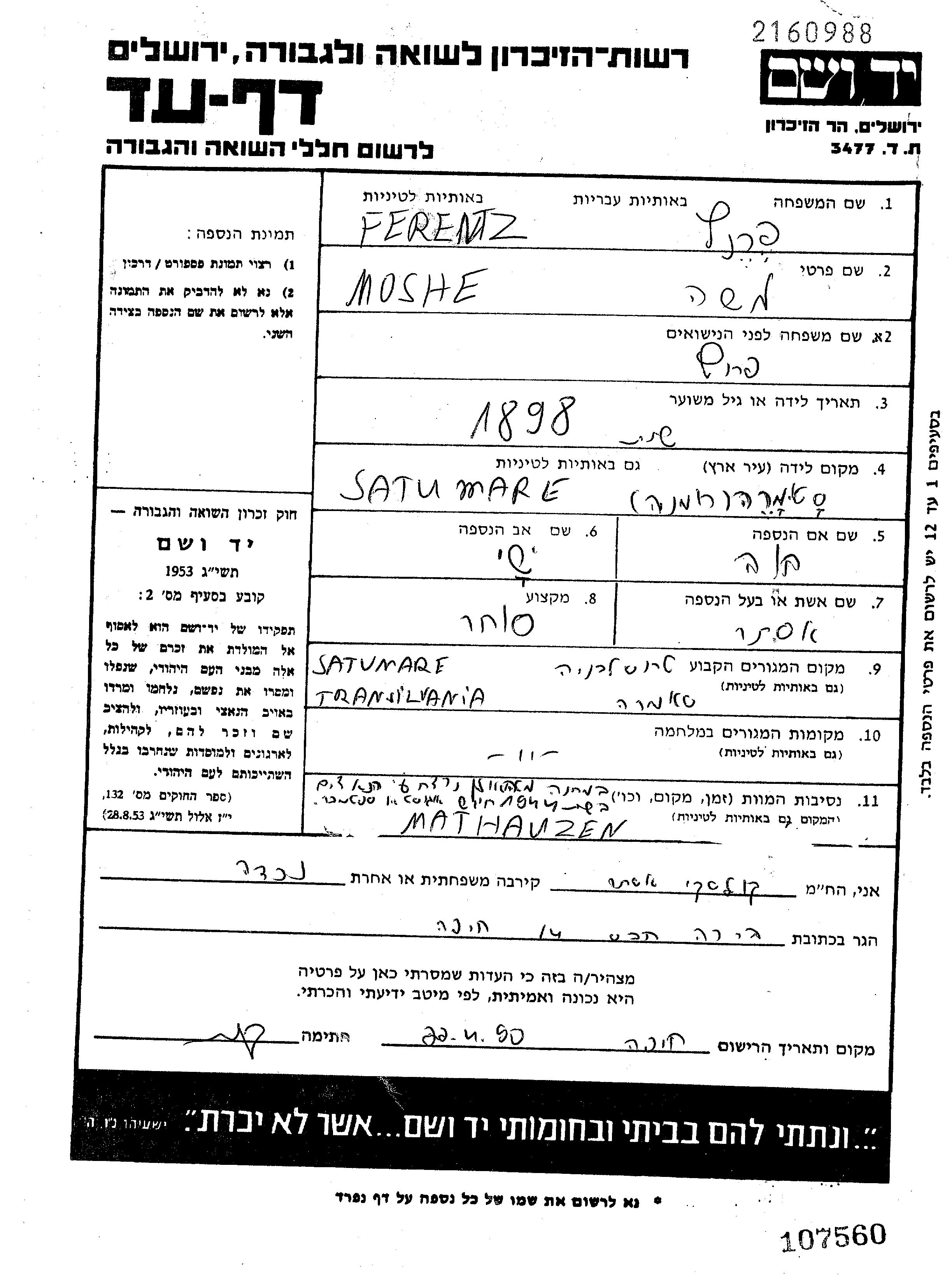 Ференц Франц Моше 1898 Сату-Маре, Румыния Лист свидетельских показаний