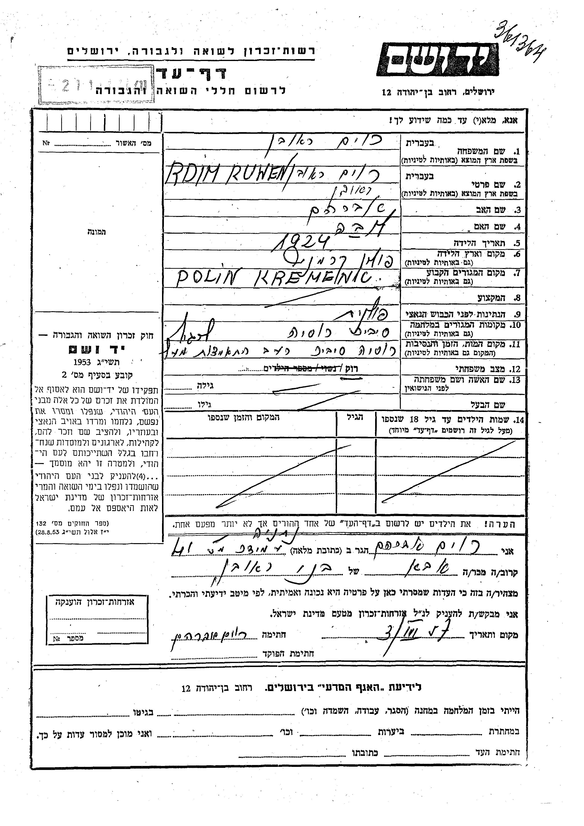 Ройм Рувен 1924 Кремениц, Польша Лист свидетельских показаний