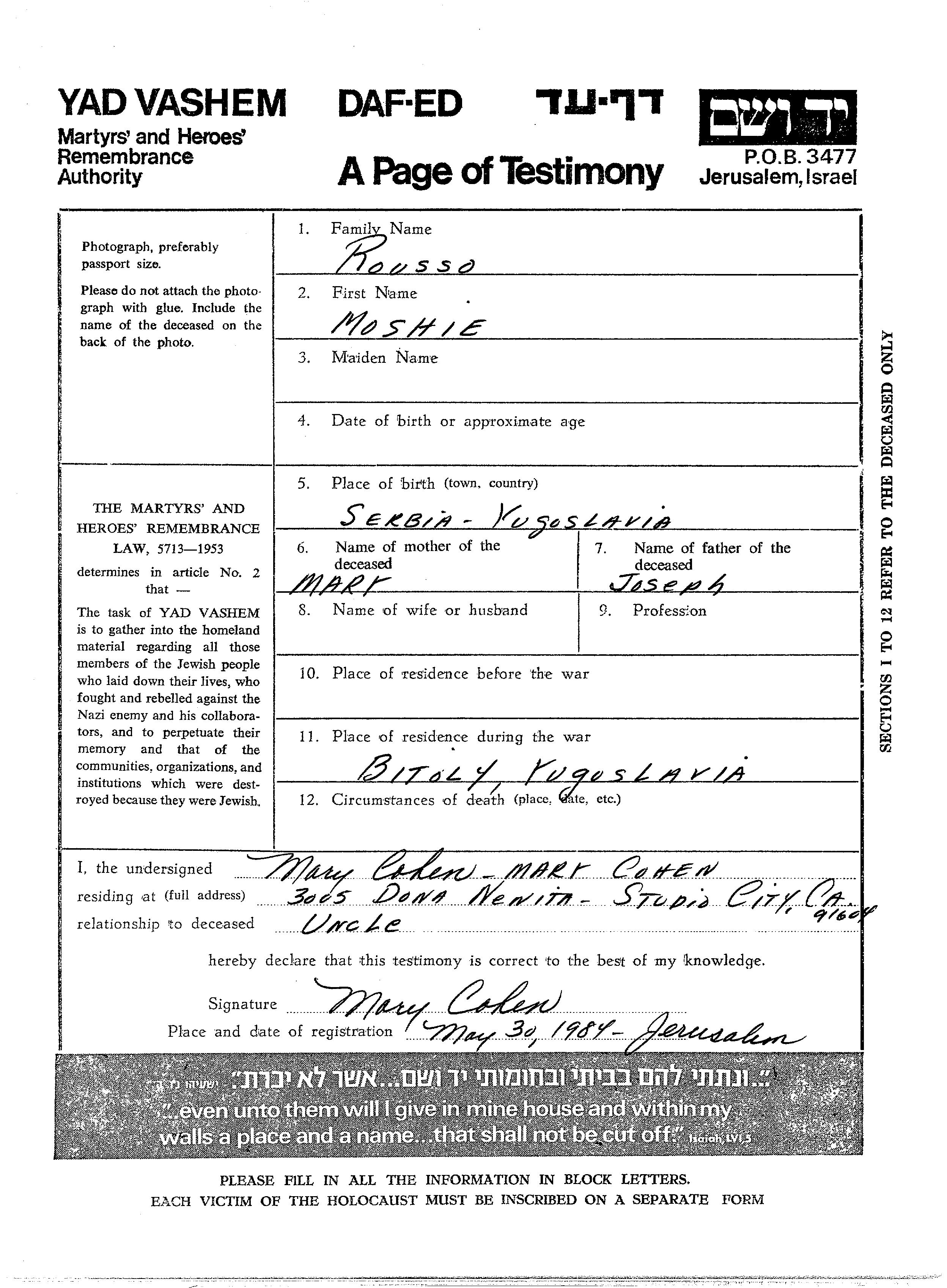Моше Руссо, место рождения: Югославия. Отец: Йосеф, mать:Мери. Место во время войны: Битоль, Югославия.
