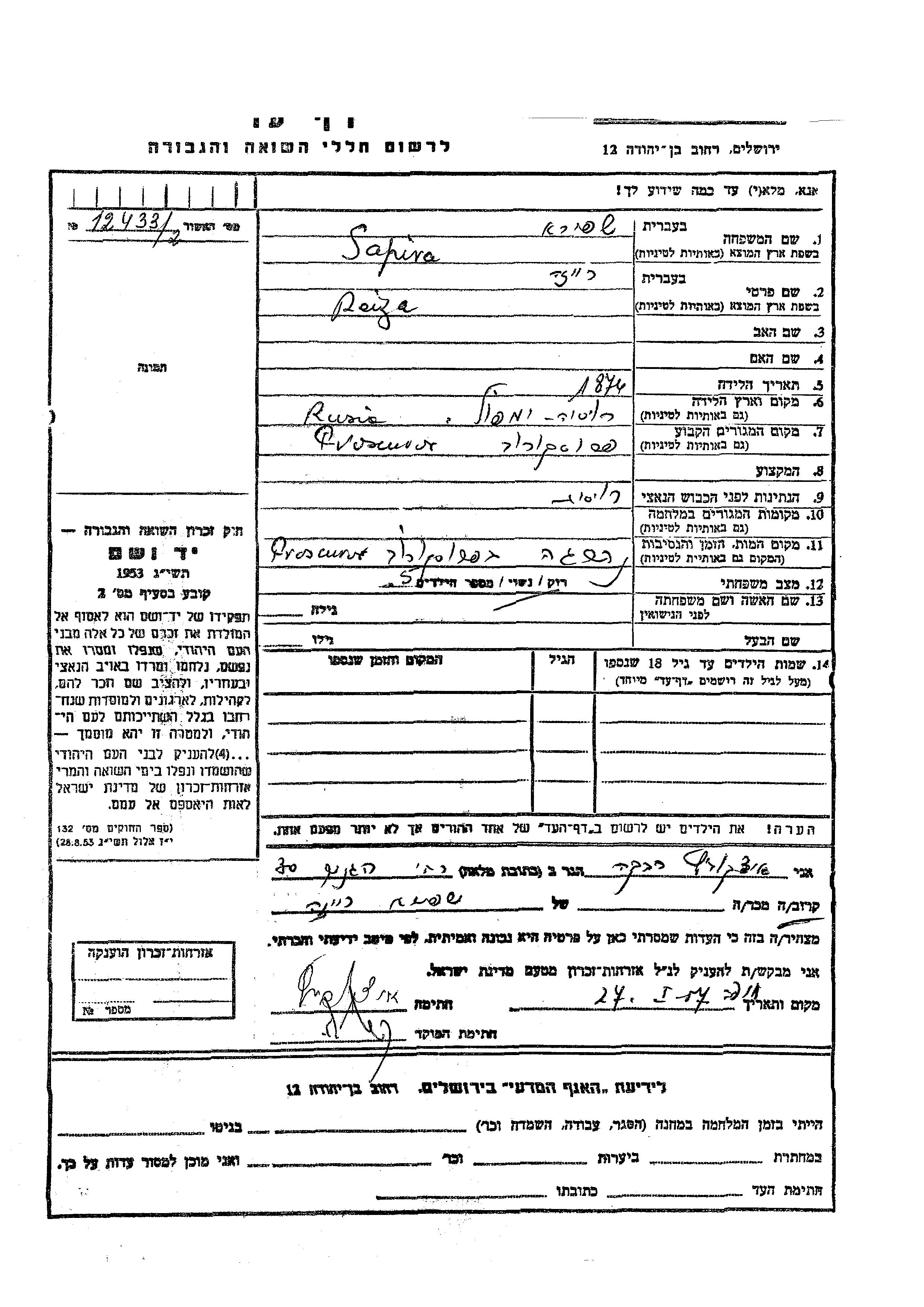 Рейза Сапира, место рождения: Ямполь, Украина (СССР). Женат / замужем. Место жительства до войны: Проскуров, Украина (СССР).