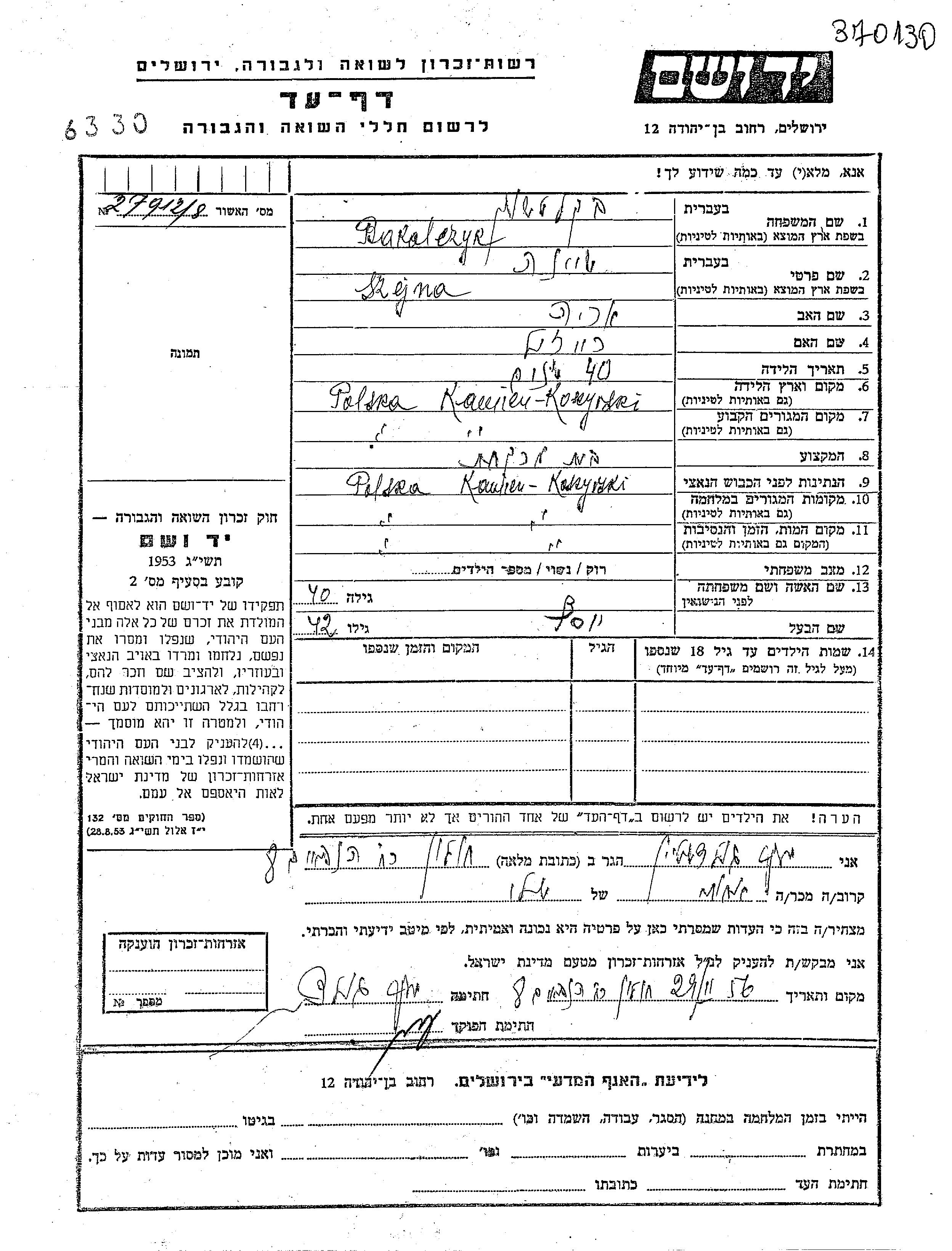 Шейна Бакальчик Бакальчук Арье Рейзил. Женат / замужем. Место жительства до войны: Камень-Каширский, Польша. Место во время войны: Камень-Каширский, Польша.