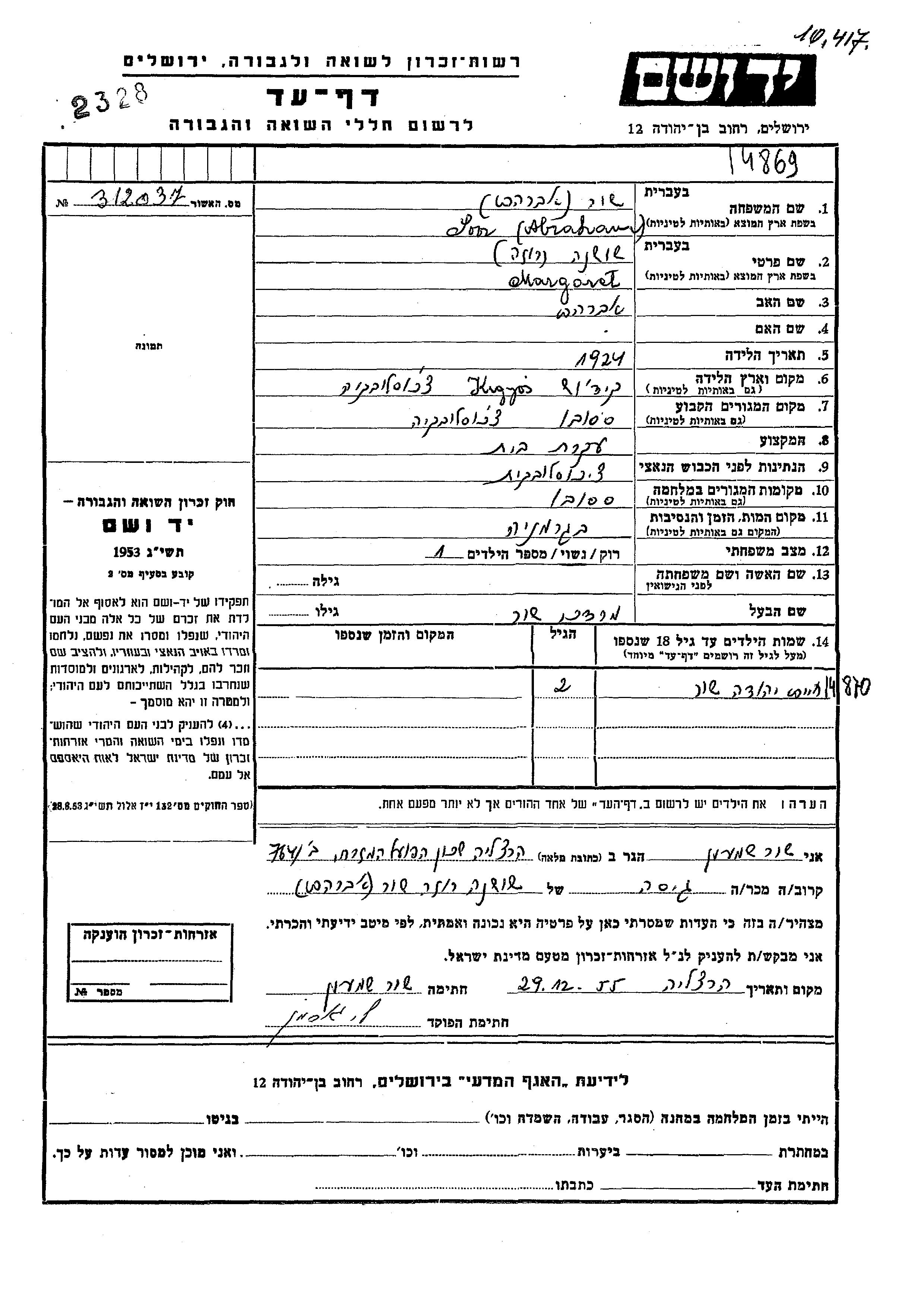 Яд Вашем - Листы свидетельских показаний Мемориального фонда