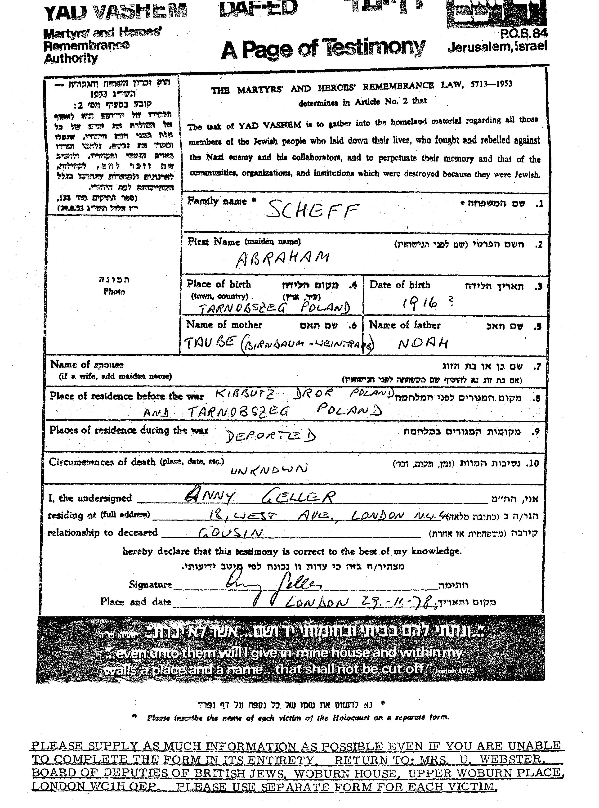 Абраам Шефф, место рождения: Тарнобжег, Польша. Отец: Ноах, mать:Тауба. Место жительства до войны: Тарнобжег, Польша.