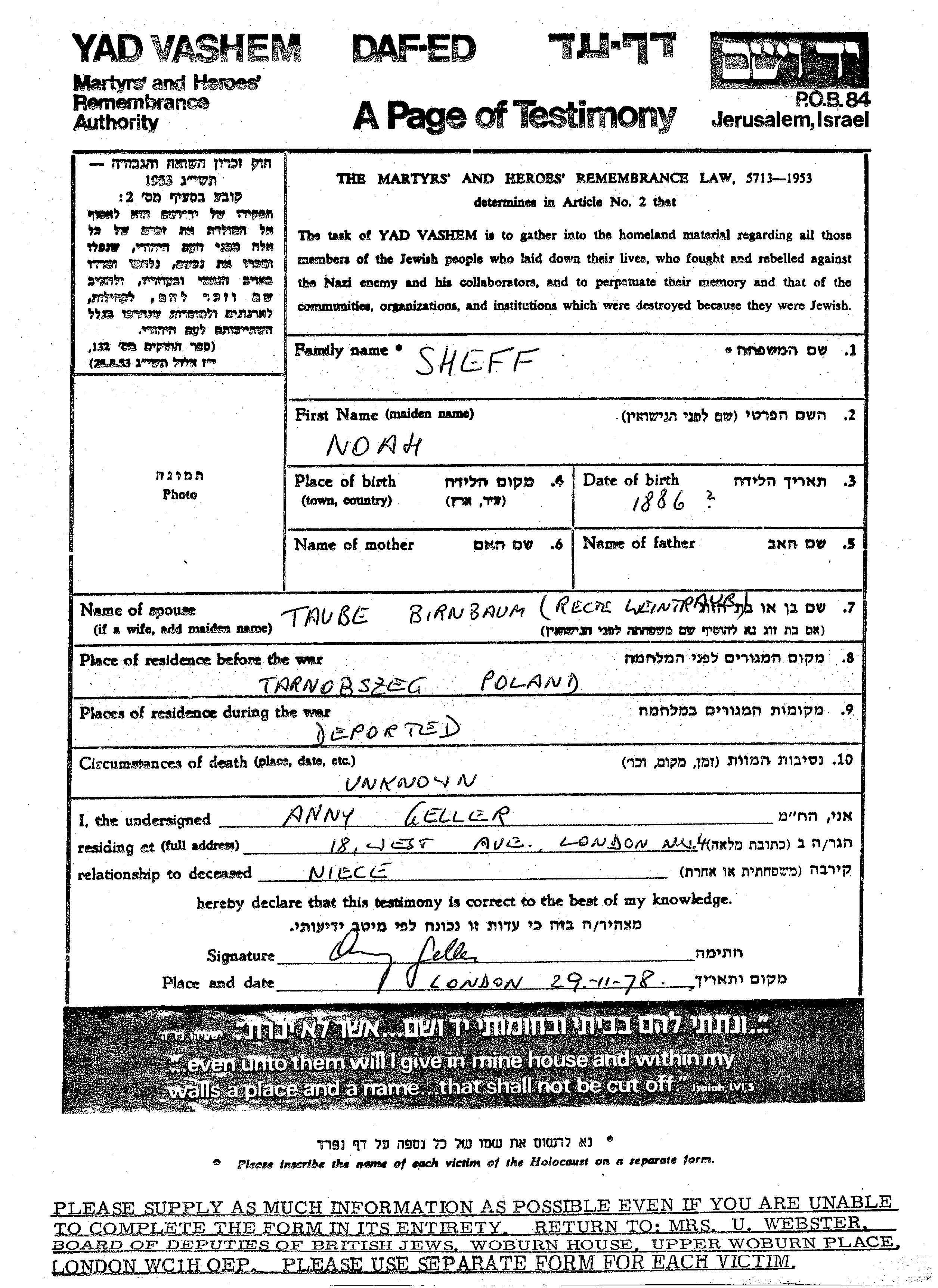 Ноах Шефф. Женат / замужем. Место жительства до войны: Тарнобжег, Польша.