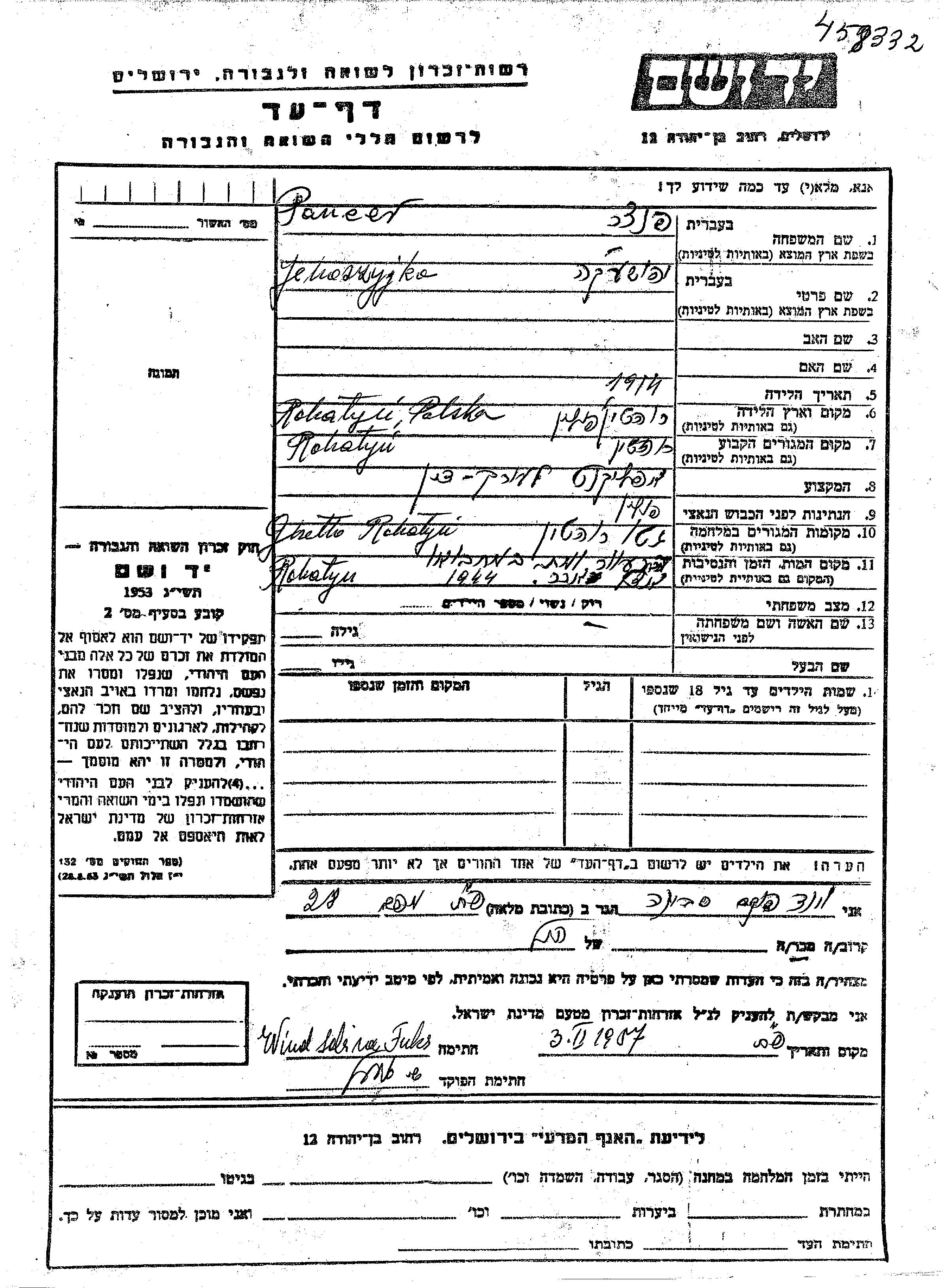 Иегошуа Панцер, место рождения: Рогатин, Польша. Ассистент юриста. Холост / не замужем. Место жительства до войны: Рогатин, Польша. Место во время войны: Рогатин, Польша.