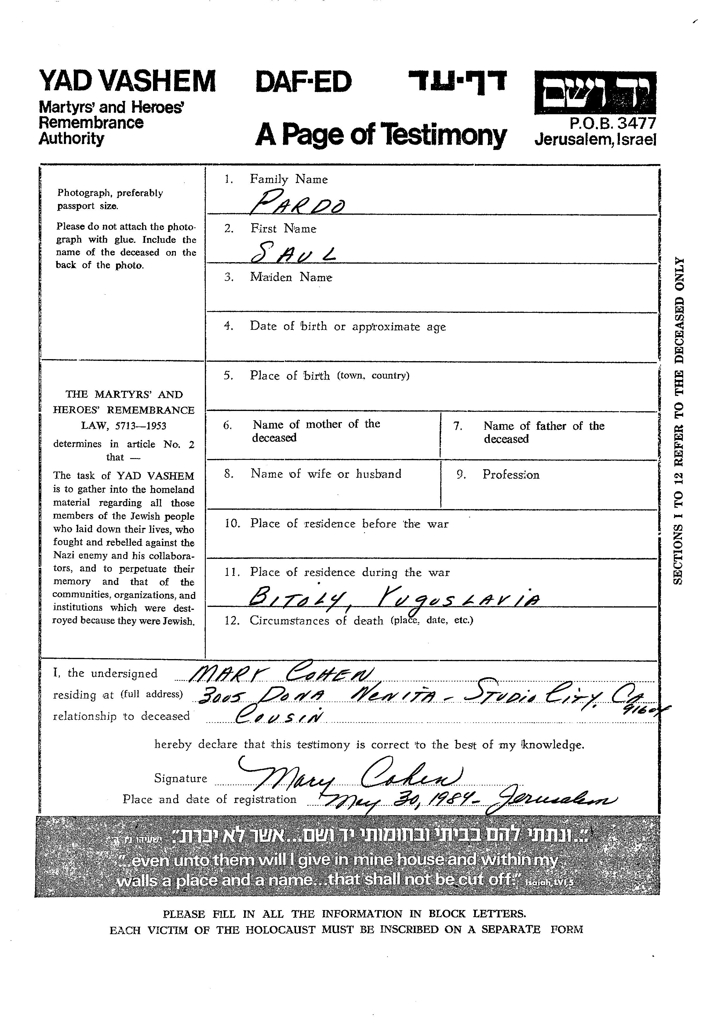 Саул Пардо. Место жительства до войны: Югославия. Место во время войны: Битола, Югославия.