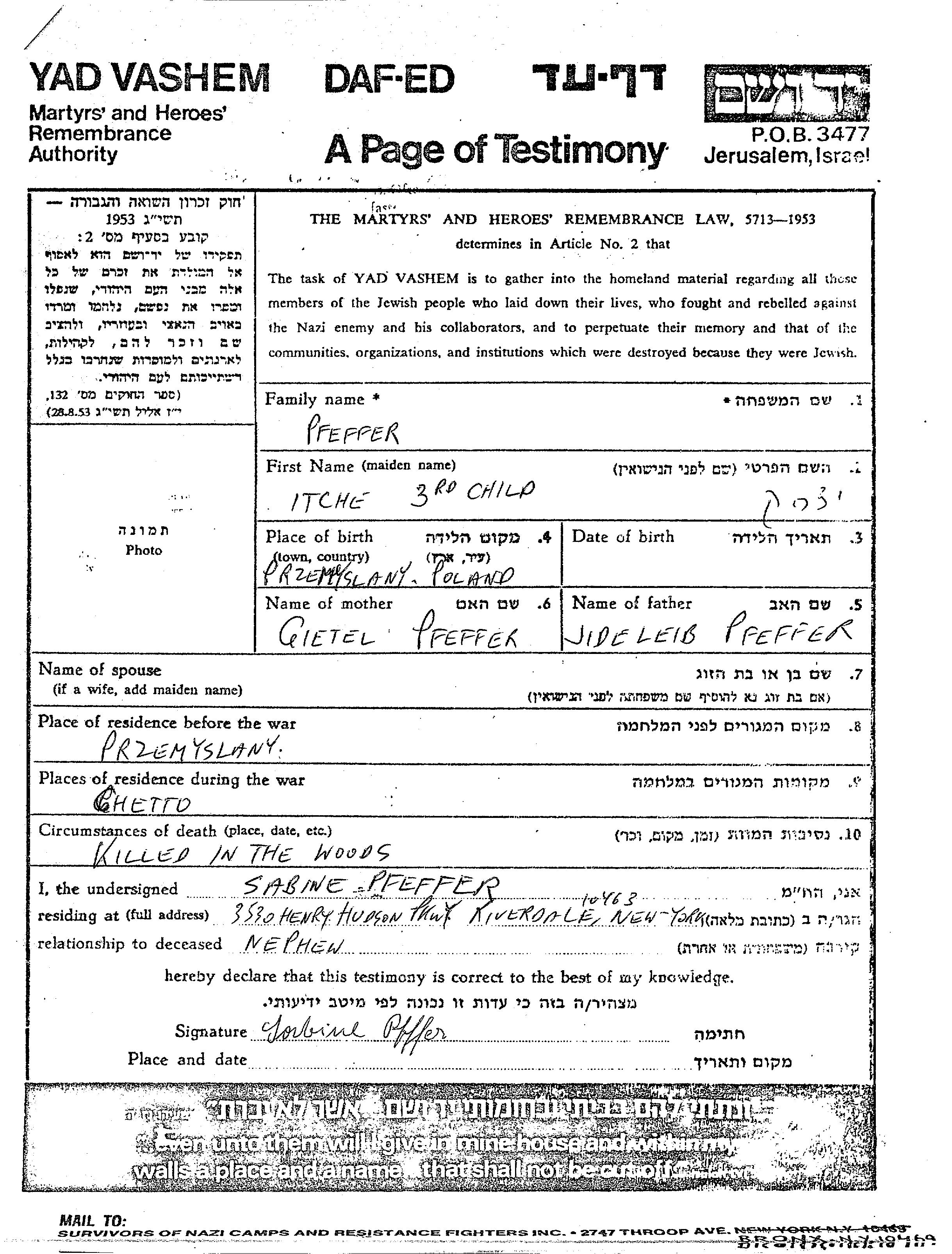 Феффер Иче Перемышляны, Польша Лист свидетельских показаний