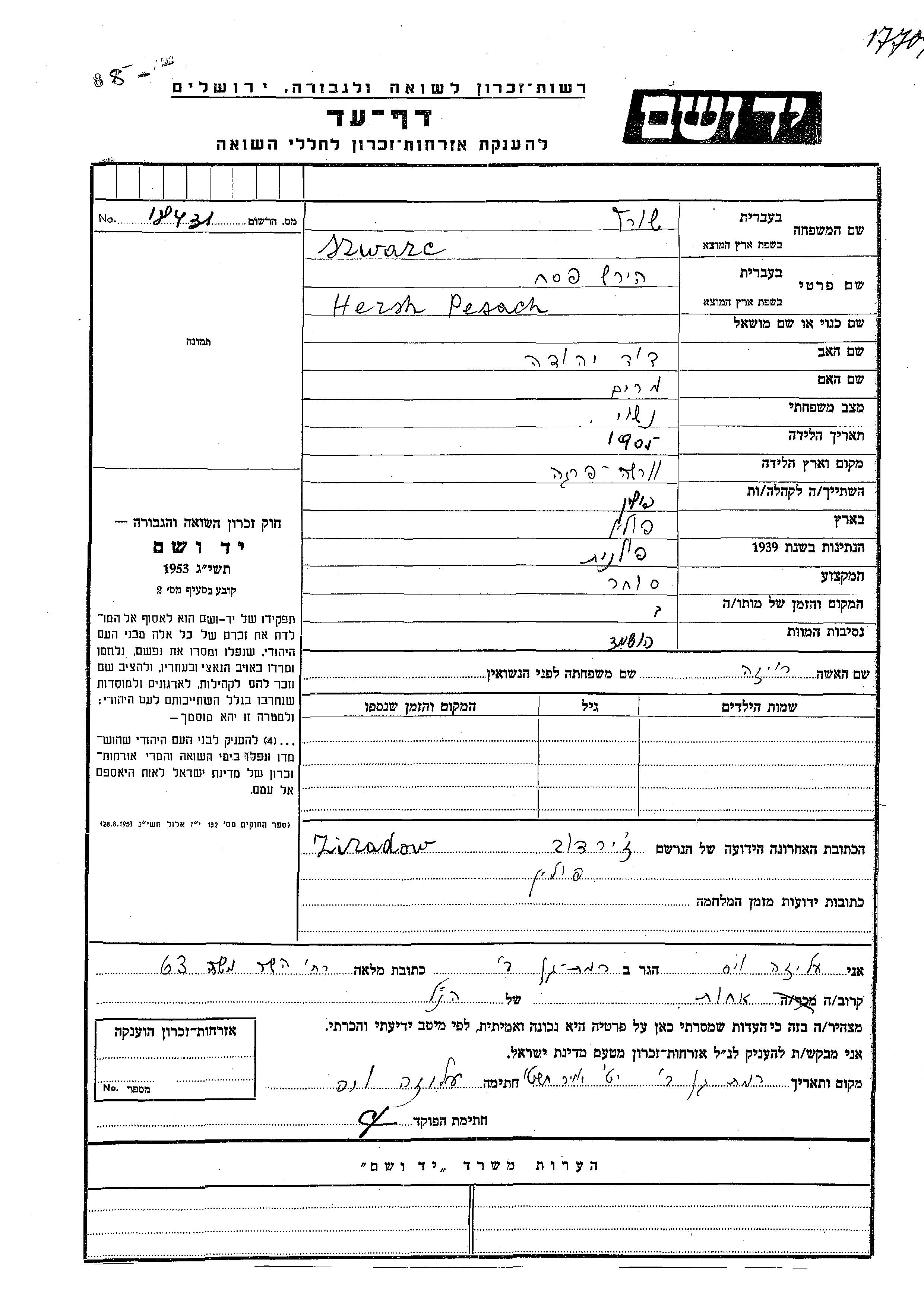 Шварц Герш Песах 1905 Жирардув, Польша Лист свидетельских показаний