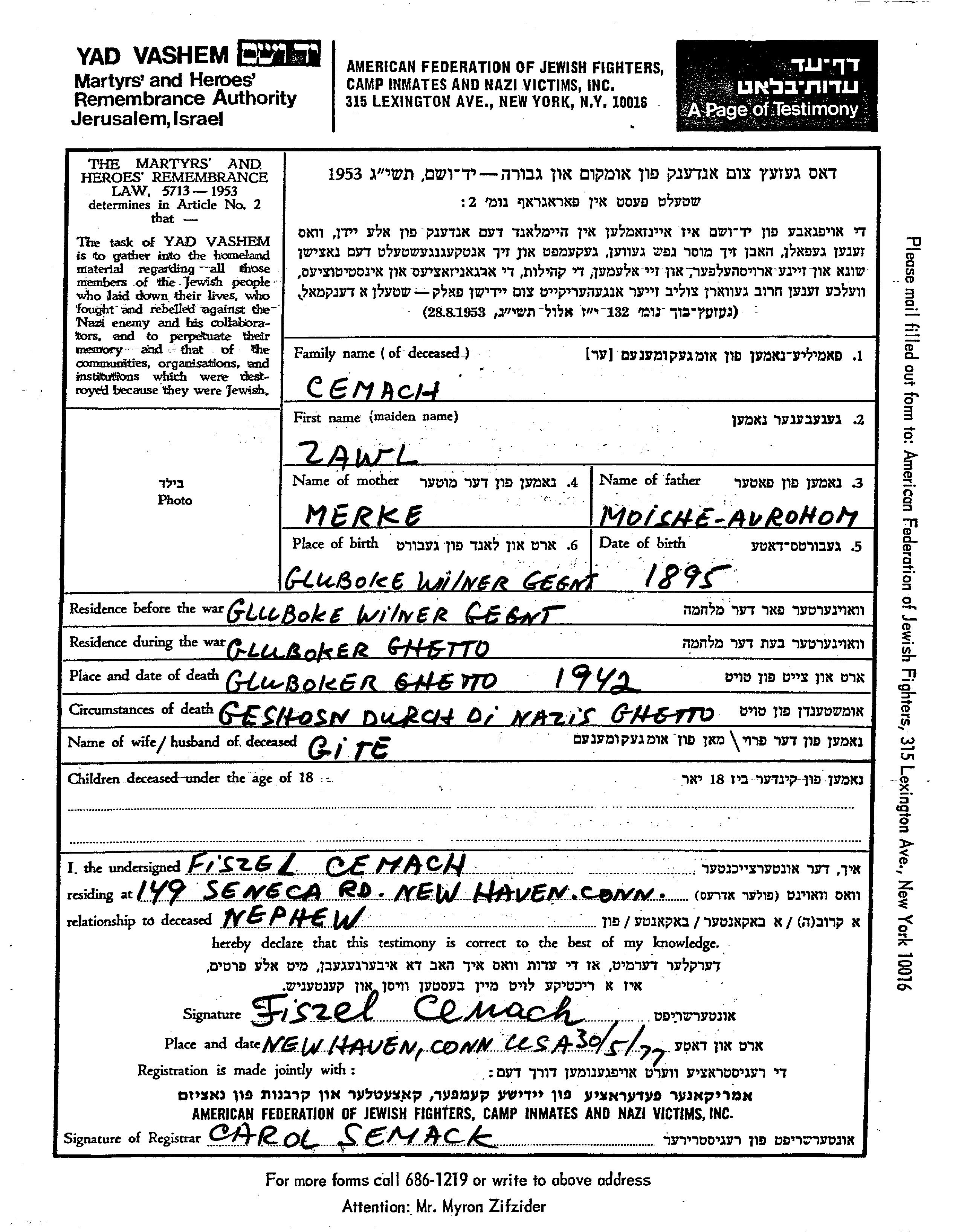 Завл Цемах, место рождения: Глембоке, Польша. Отец: Мойше Аврохом, mать:Мерке. Женат / замужем. Место жительства до войны: Глембокие, Польша. Место во время войны: Глембокие, Польша.