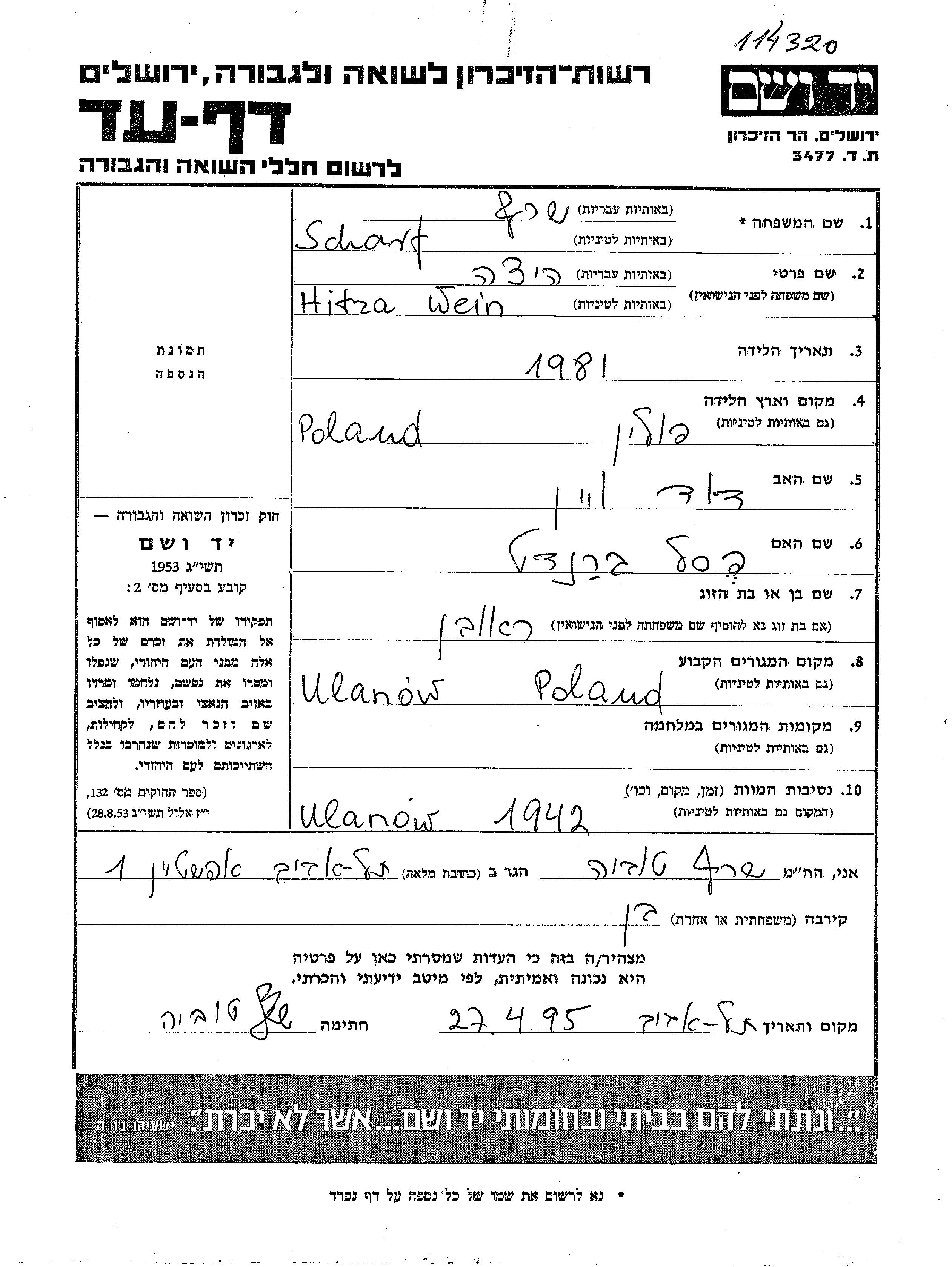 Хица Шарф, девичья фамилия Вейн, место рождения: Польша. Отец: Давид, mать:Песль Песель, девичья фамилия Брандт Бернат. Женат / замужем. Место жительства до войны: Улянув, Польша. Место во время войны: Улянув, Польша.