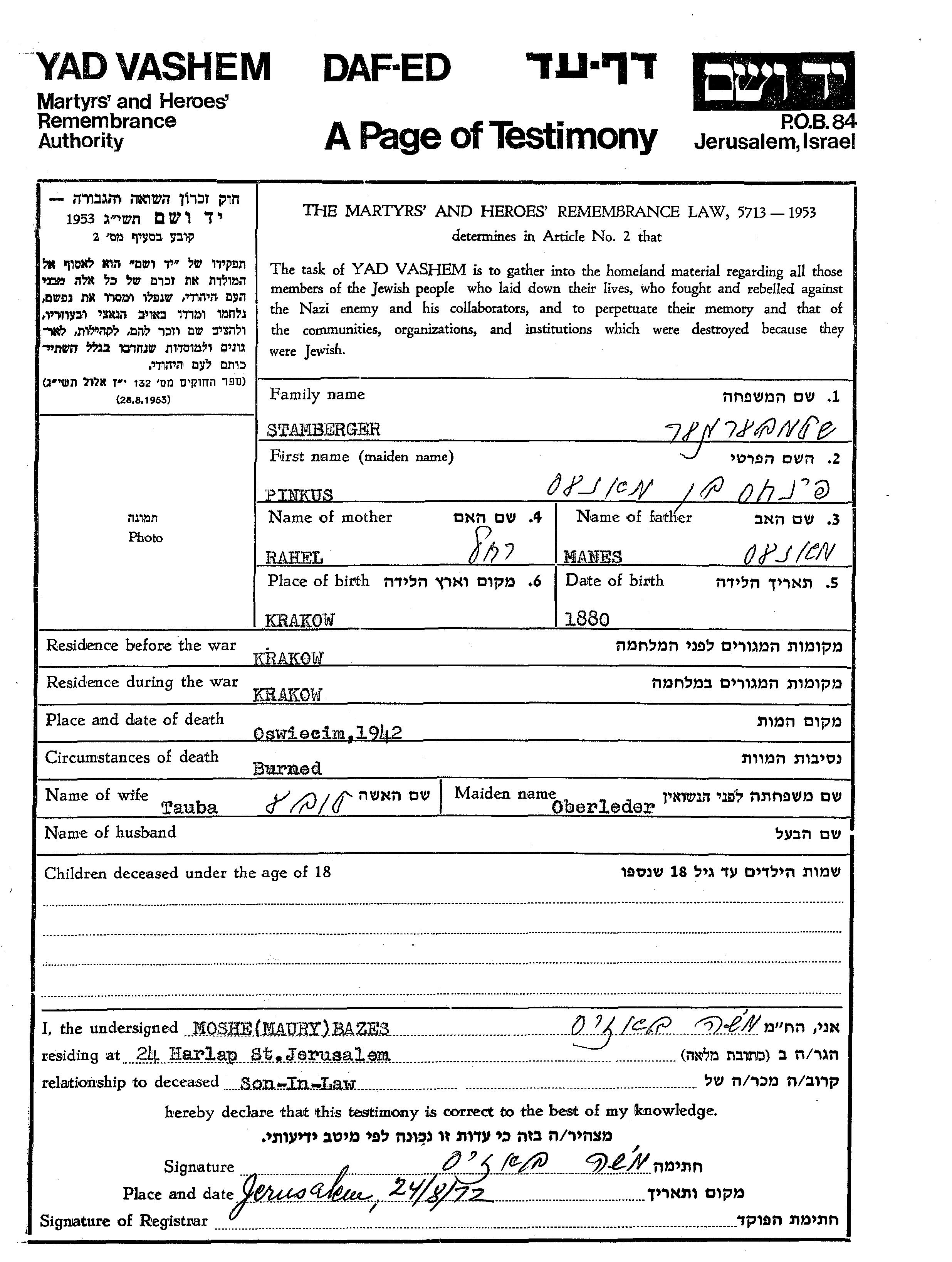 Пинкус Штамбергер, место рождения: Краков, Польша. Отец: Манес, mать:Рахель. Место жительства до войны: Краков, Польша. Место во время войны: Краков, Польша.