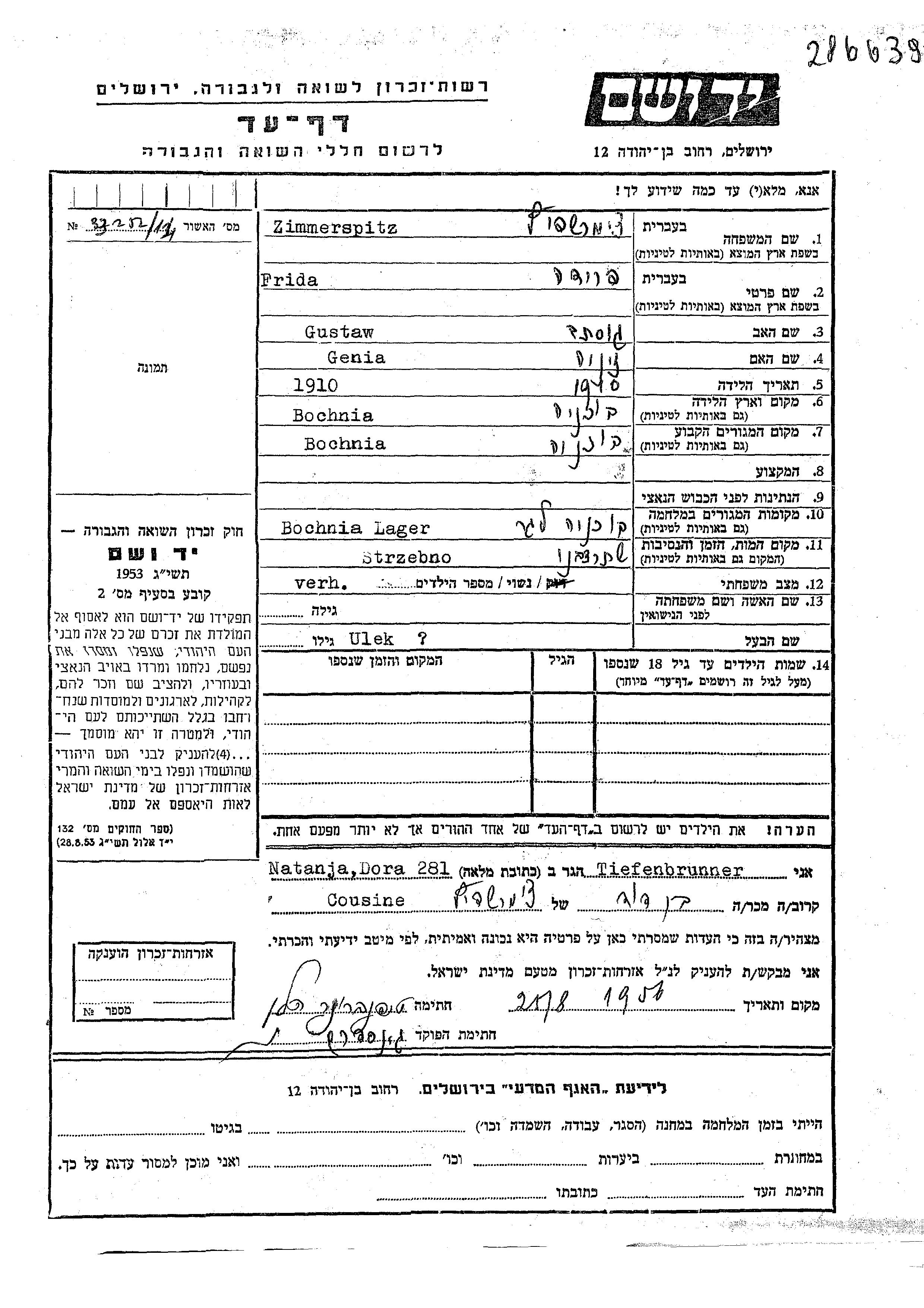 Фрида Циммершпиц, место рождения: Бохня, Польша. Отец: Густав, mать:Геня Женя. Женат / замужем. Место жительства до войны: Бохня, Польша. Место во время войны: Бохня, Польша.