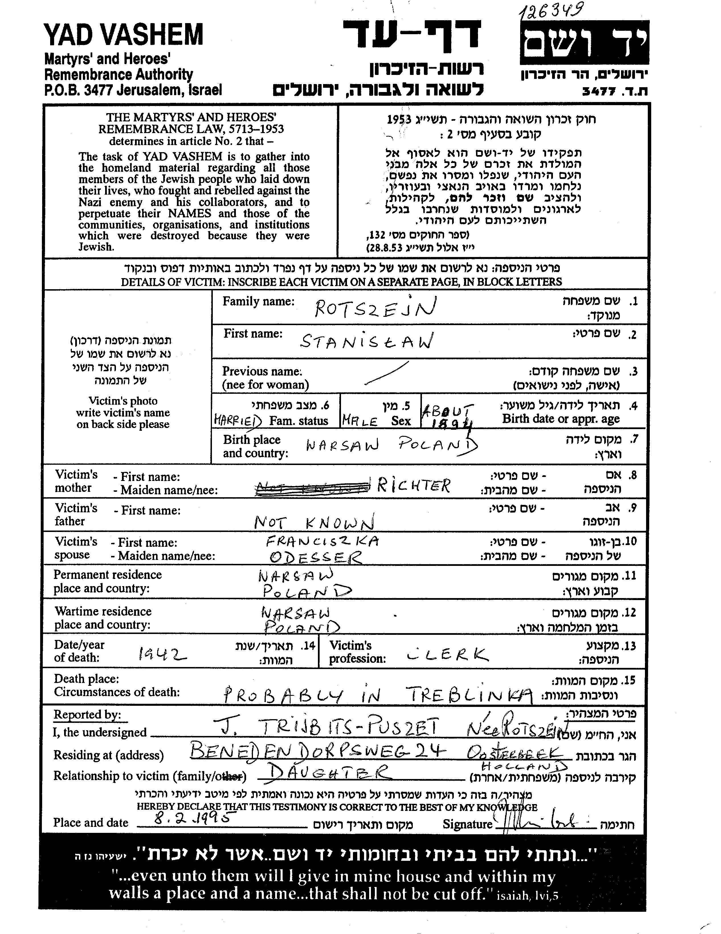 Станислав Ротшейн, место рождения: Варшава, Польша. Клерк. Женат / замужем. Место жительства до войны: Варшава, Польша. Место во время войны: Варшава, Польша.