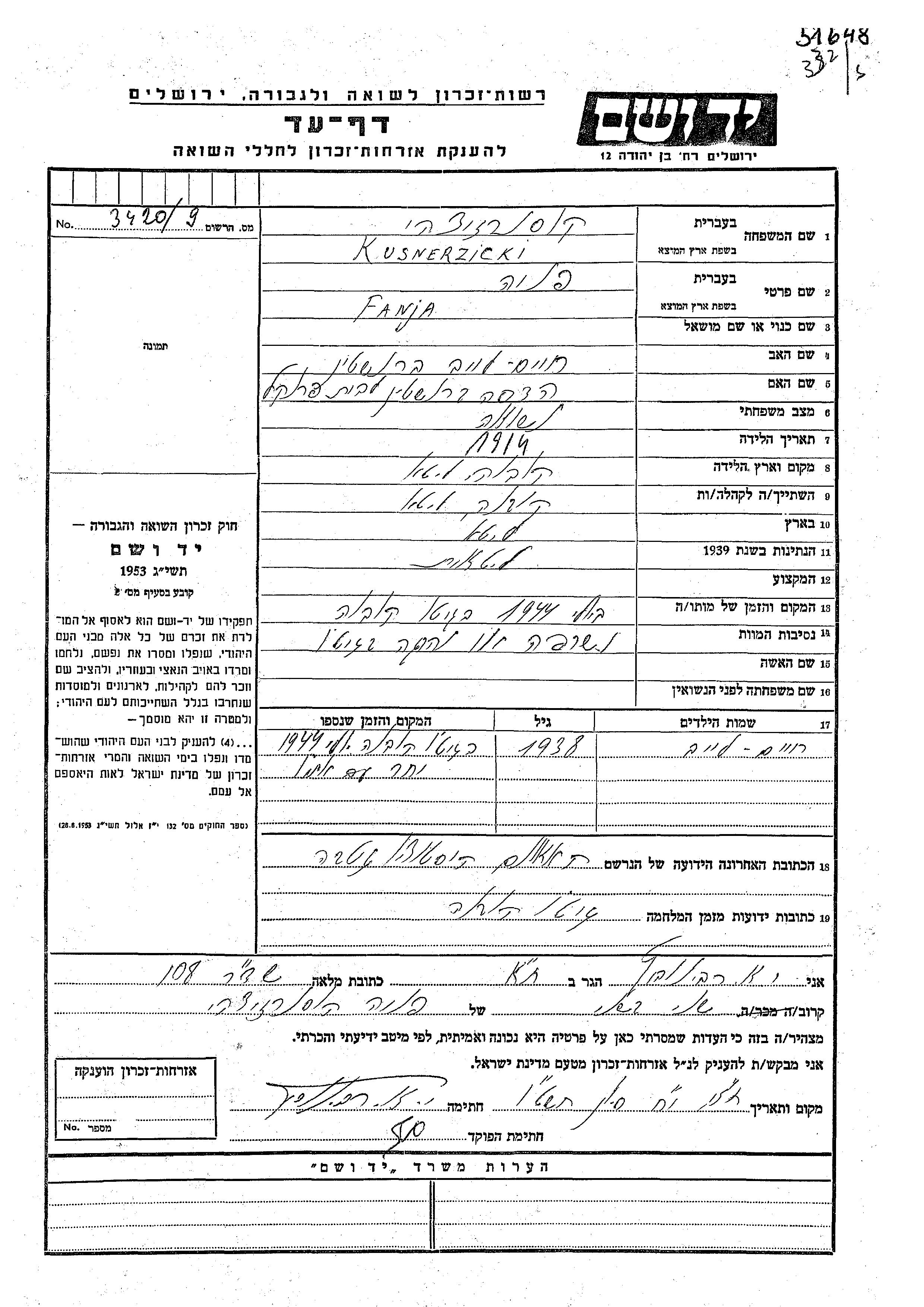 Фанья Куснежицки, девичья фамилия Барнштейн, место рождения: Ковно, Литва. Отец: Хаим Лейб, mать:Хадаса. Женат / замужем. Место жительства до войны: Ковно, Литва. Место во время войны: Ковно, Литва.