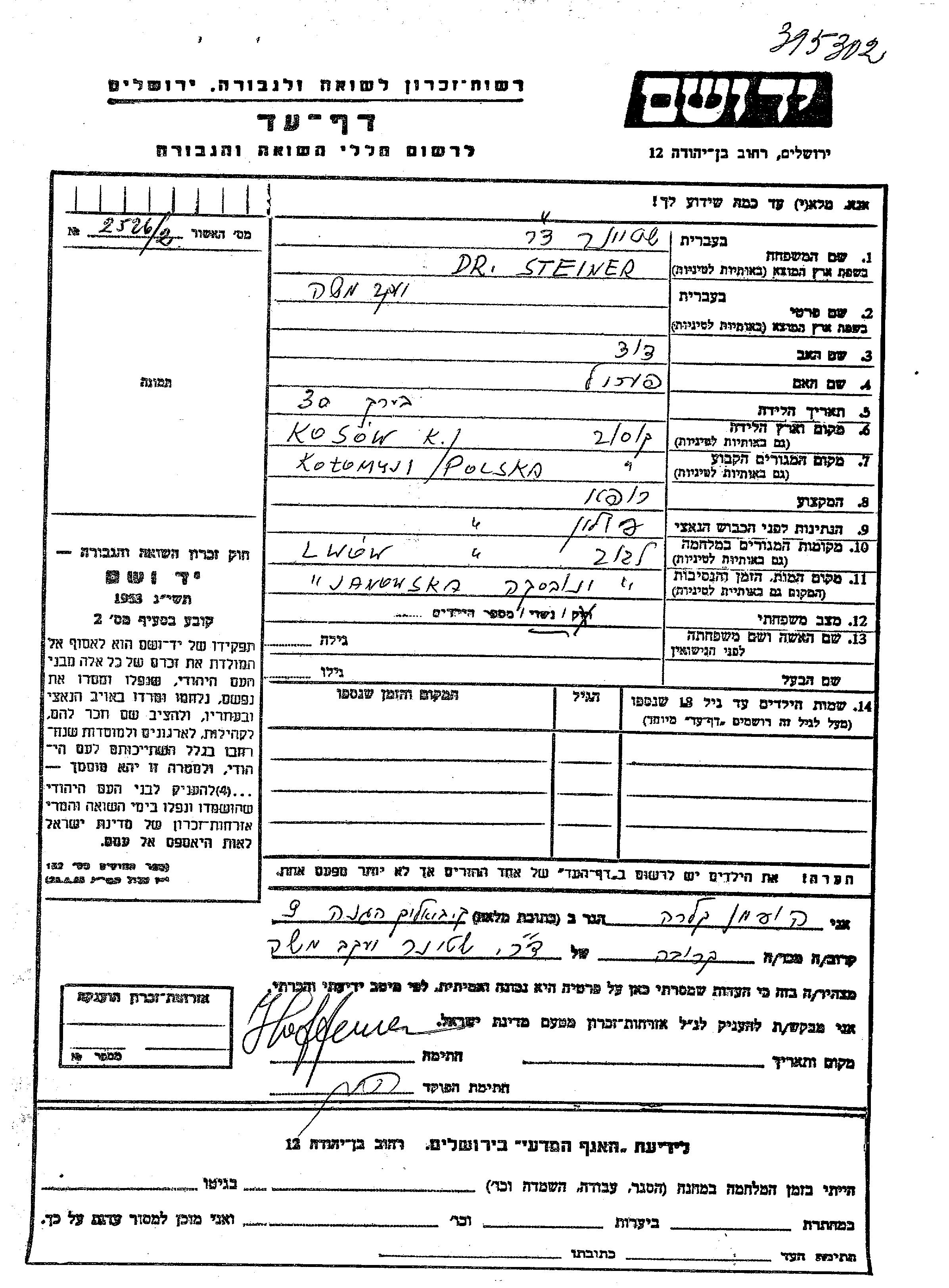 Др. Яков Моше Штайнер, место рождения: Косов, Польша. Отец: Давид, mать:Перил. Врач. Женат / замужем. Место жительства до войны: Косов, Польша. Место во время войны: Львов, Польша.