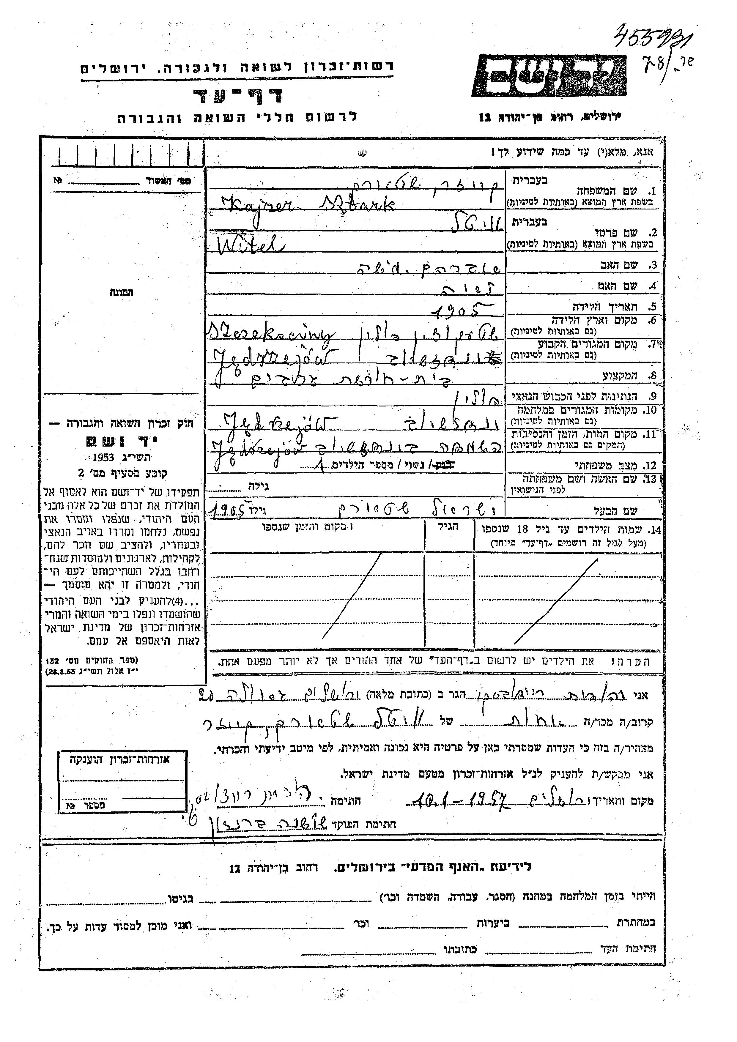 Витель Кайзер Штарк, место рождения: Щекоцины, Польша. Отец: Авраам Миша, mать:Лея. Женат / замужем. Место жительства до войны: Енджеюв, Польша. Место во время войны: Енджеюв, Польша.