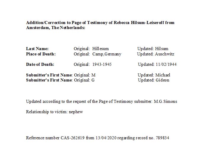 Хильсум Лейзероф Ребекка 1913 Амстердам, Нидерланды Лист свидетельских показаний