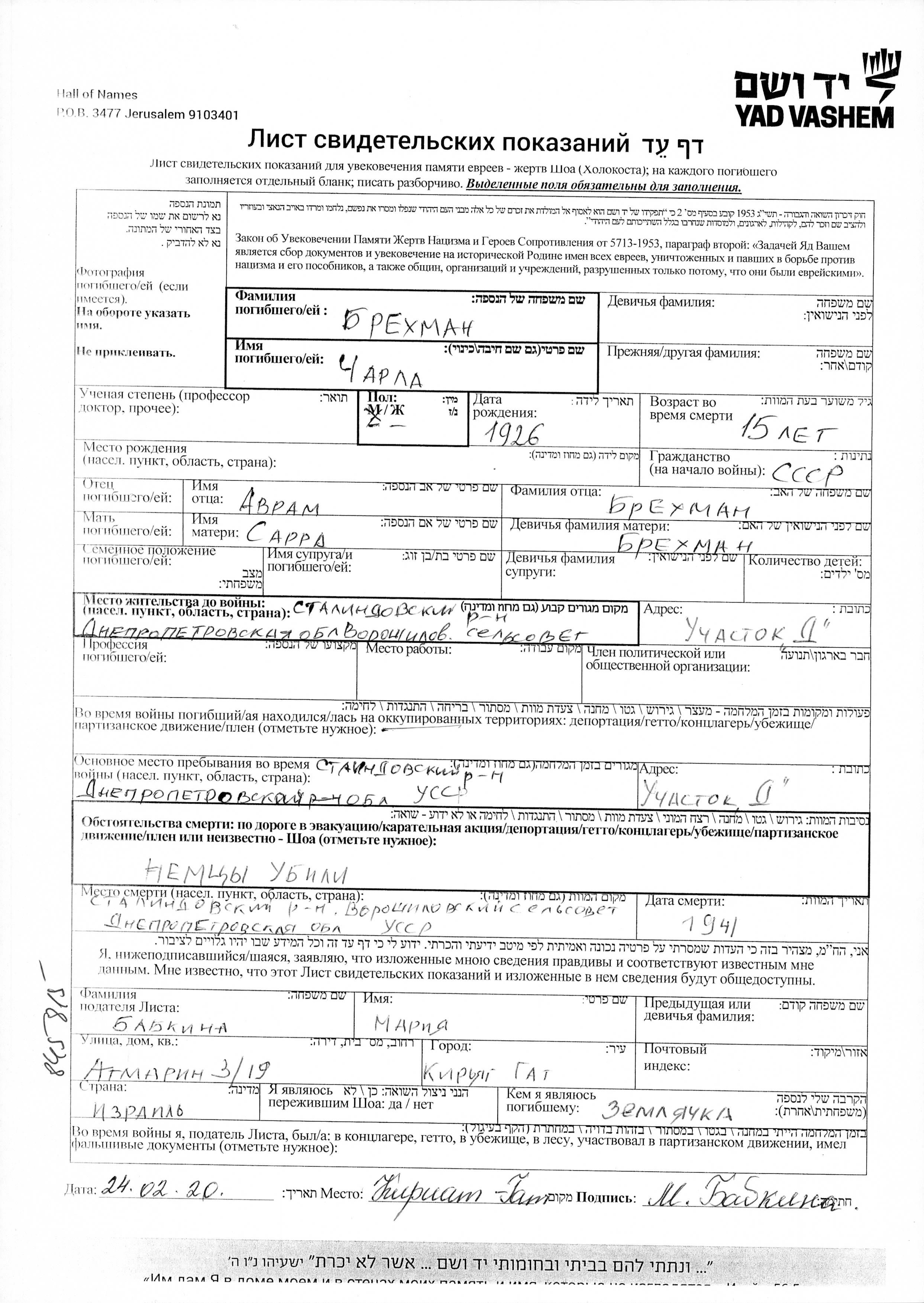Яд Вашем - Листы свидетельских показаний Мемориального фонда